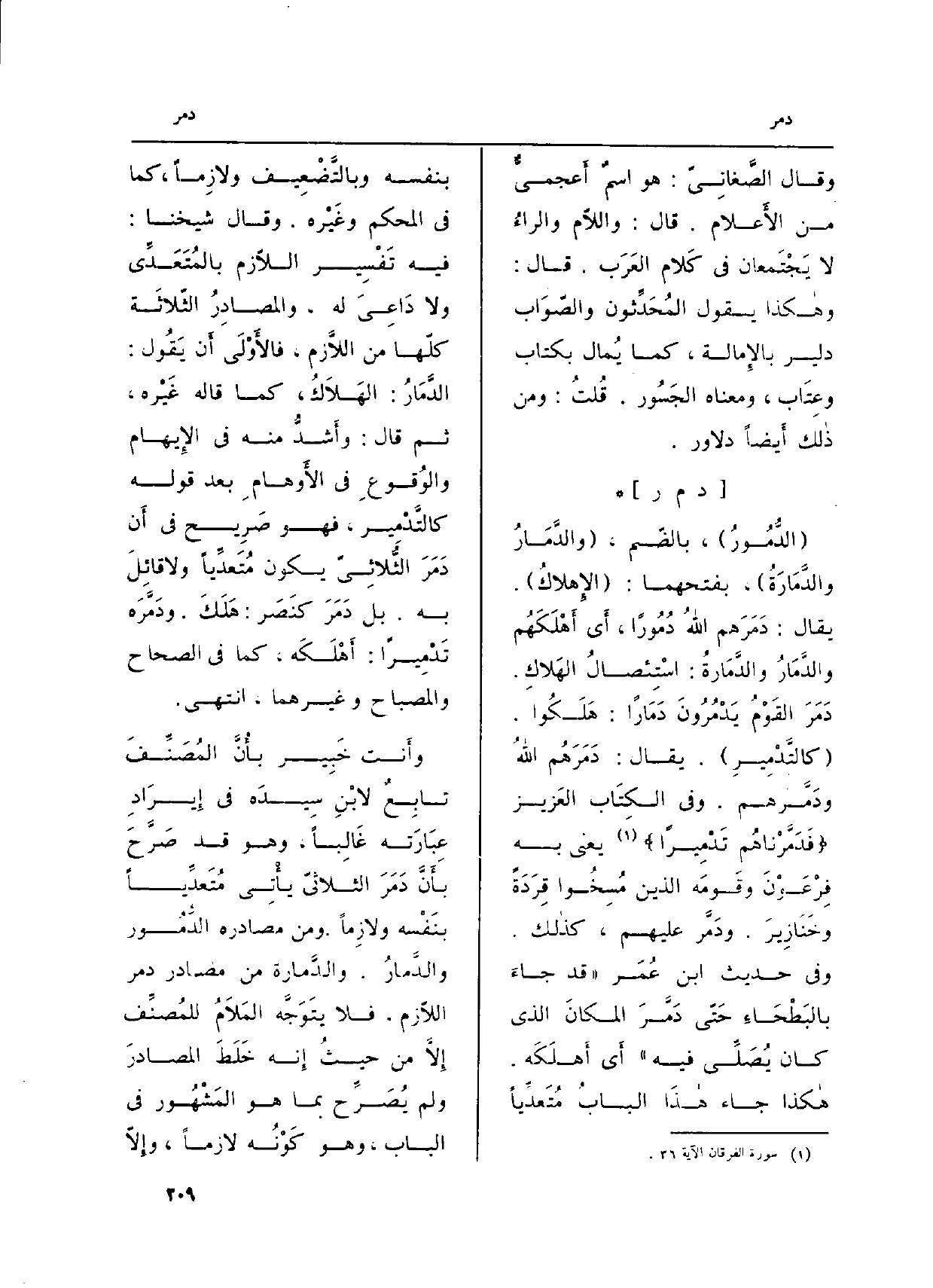 : (الدُّمُورُ) ، بالضّم، (والدَّمَارُ والدَّمَارَةُ) ، بفتحهما: (الإِهلاكُ) . يُقَال: دَمَرَهم اللَّهُ دُمُوراً، أَي أَهْلَكَهُم والدَّمَارُ والدَّمَارةُ: اسْتِئصالُ الهَلاكِ. دَمَرَ القَوْمُ يَدْمُرُونَ دَمَاراً: هَلَكُوا. (كالتَّدْمِيرِ) . يُقَال: دَمَرَهُم اللَّهُ ودَمَّرهم. وَفِي الكِتَاب العَزيز {فَدَمَّرْنَاهُمْ تَدْمِيراً} (الْفرْقَان: 36) يَعْنِي بِهِ فِرْعَوْنَ وقَومَه الَّذين مُسِخُوا قِرَدَةً وخَنَازِيرَ. ودَمَّر عَلَيْهِم، كذالك. وَفِي حَدِيث ابْن عُمَر (قد جاءَ بالبَطْحَاءِ حَتّى دَمَّرَ المكانَ الَّذِي كَانَ يُصَلِّي فِيهِ) أَي أَهلَكَه. هاكذا جَاءَ هاذَا البابُ مُتَعدِّياً بِنَفسِهِ وبالتَّضْعِيف ولازِماً، كَمَا فِي الْمُحكم وغَيرْه. وَقَالَ شَيخنَا: فِيهِ تَفْسِير اللّازم بالمُتَعَدِّي وَلَا دَاعِيَ لَهُ، والمصادِرُ الثّلاثَة كلّها من اللَّازم، فالأَوْلَى أَن يَقُول: الدَّمَارُ: الهَلاَكُ، كَمَا قَالَه غَيْره، ثمَّ قَالَ: وأَشدُّ مِنْهُ فِي الإِيهام والوُقوعِ فِي الأَوهامِ بعد قَوْله كالتَّدْمِير، فَهُوَ صَرِيح فِي أَن دَمَرَ الثُّلاثِيّ يكون مُتَعدِّياً وَلَا قائِلَ بِهِ. بل دَمَرَ كنَصَر: هَلَكَ. ودَمَّرَه تَدْمِيراً: أَهْلَكَه، كَمَا فِي الصِّحَاح والمصباح وَغَيرهمَا، انْتهى.