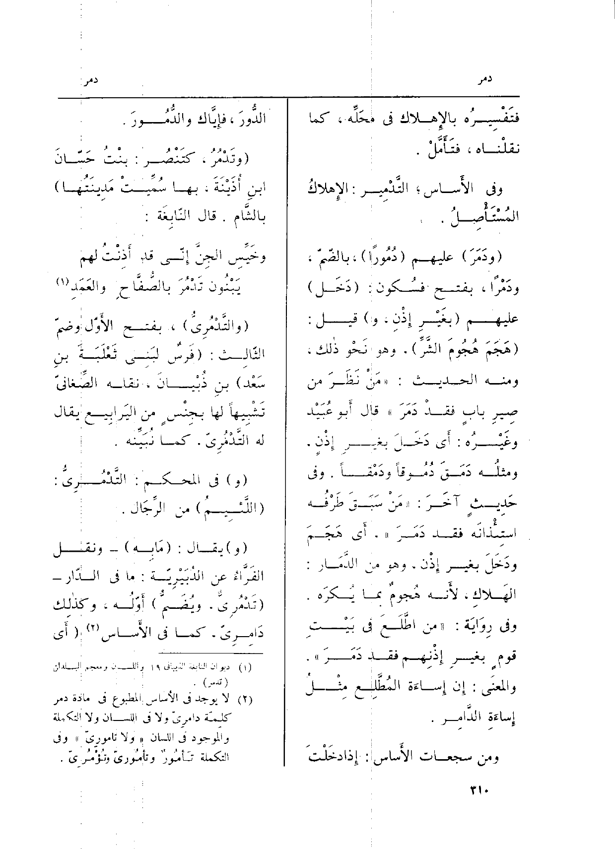 (ودَمَرَ) عَلَيْهِم (دُمُوراً) ، بالضّمّ، ودَمْراً، بِفَتْح فسُكون: (دَخَل) عَلَيْهِم (بغَيْرِ إِذْنِ، و) قيل: (هَجَمَ هُجُومَ الشَّرِّ) ، وَهُوَ نَحْو ذالك، وَمِنْه الحَدِيث: (مَنْ نَظَرَ من صِيرِ بَاب فقدْ دَمَرَ) قَالَ أَبو عُبَيْد وغَيْرُه: أَي دَخَلَ بغيرِ إِذْنٍ، ومثلُه دَمَقَ دُمُوقا ودَمْقاً. وَفِي حَدِيثٍ آخَرَ: (مَنْ سَبَقَ طَآحفُه استِئْذانَه فقد دَمَرَ) . أَي هَجَمَ ودَخَلَ بِغَيْر إِذْن، وَهُوَ من الدَّمَار: الهَلاكِ، لأَنَّه هُجومٌ بِمَا يُكرَه. وَفِي رِوَايَة: (من اطَّلَع فِي بَيْتِ قومٍ بغيرِ إِذْنِهم فقد دَمَرَ) . والمعنَى: إِن إِساءَة المُطَّلِع مِثْلُ إِساءَةِ الدَّامِر.