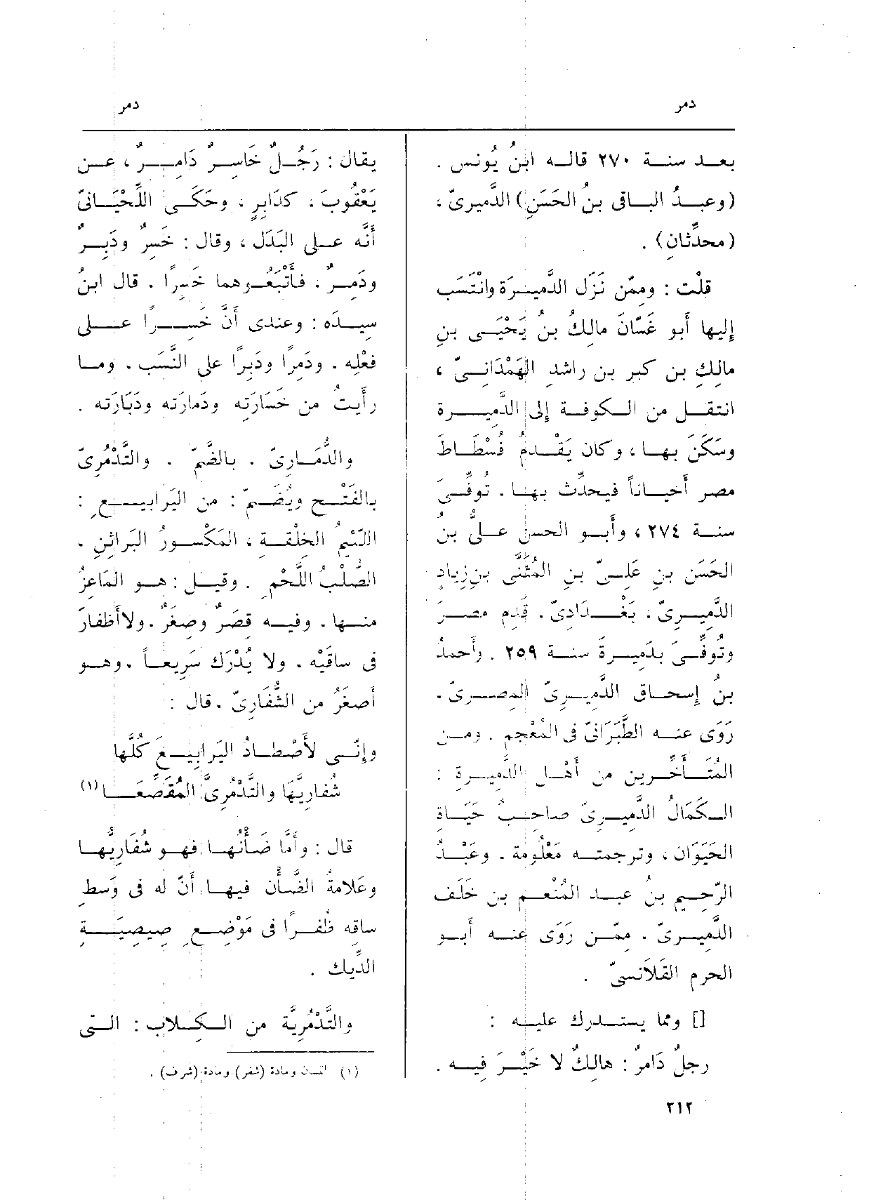 قلْت: ومِمّن نَزَلَ الدَّميرَة وانْتَسَب إِليها أَبو غَسّانَ مالِكُ بنُ يَحْيَى بنِ مالِكِ بن كبر بن راشدِ الهَمْدَانِيّ، انْتقل من الْكُوفَة إِلى الدَّمِيرة وسَكَن بهَا، وَكَانَ يَقْدمُ فُسْطَاطَ مصر أَحياناً فيحدِّث بهَا، تُوفِّيَ سنة 274، وأَبو الْحسن عليُّ بنُ الحَسَن بنِ عَلِيّ بنِ المُثَنَّى بن زِيادٍ الدَّمِيرِيّ، بَغْدَادِيّ، قَدِم مصرَ وتُوفِّيَ بدَمِيرَةَ سنة 259. وأحمدُ بنُ إِسحاق الدَّمِيرِيّ المِصريّ، رَوَى عَنهُ الطَّبَرَانيّ فِي المُعْجمِ. وَمن المُتَأَخِّرين من أَهْل الدَّمِيرةِ: الكَمَالُ الدَّمِيريّ صاحِبُ حَيَاةِ الحَيَوان، وترجمته مَعْلُومة، وعَبْدُ الرّحِيم بنُ عبد المُنْعم بن خَلَف الدَّمِيريّ، مِمّن رَوَى عَنهُ أَبو الْحرم القَلاَنسيّ.