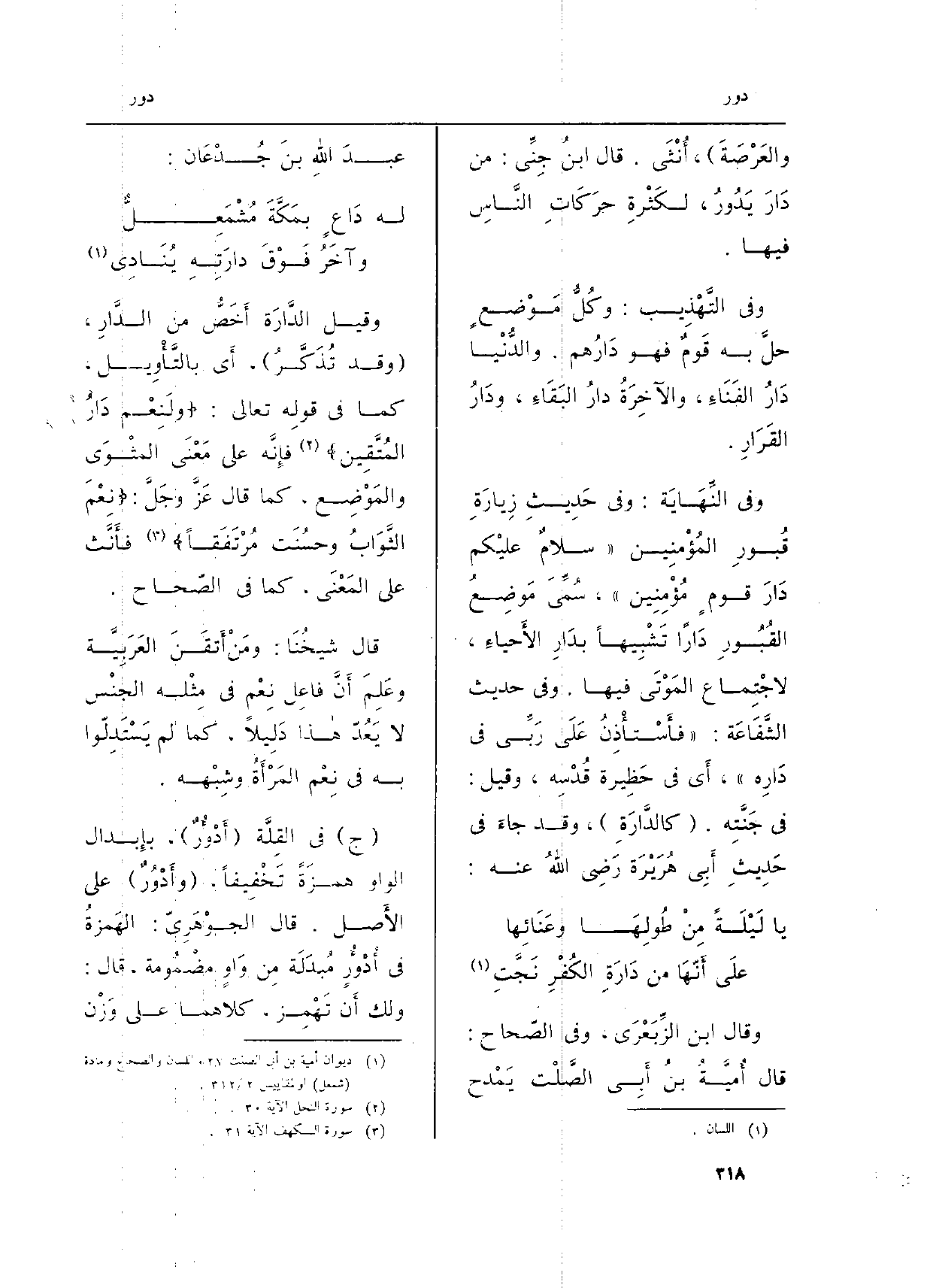 وَقيل} الدَّارَةَ أَخَصُّ من الدَّارِ، (وَقد تُذَكَّرُ) ، أَي بالتَّأْوِيل، كَمَا فِي قَوْله تَعَالَى: {وَلَنِعْمَ {دَارُ الْمُتَّقِينَ} (النَّحْل: 30) فإِنَّه على مَعْنَى المَثْوَى والمَوْضِع، كَمَا قَالَ عَزَّ وجَلَّ: {نِعْمَ الثَّوَابُ وَحَسُنَتْ مُرْتَفَقاً} (الْكَهْف: 31) فأَنَّث على المَعْنَى، كَمَا فِي الصّحاح.