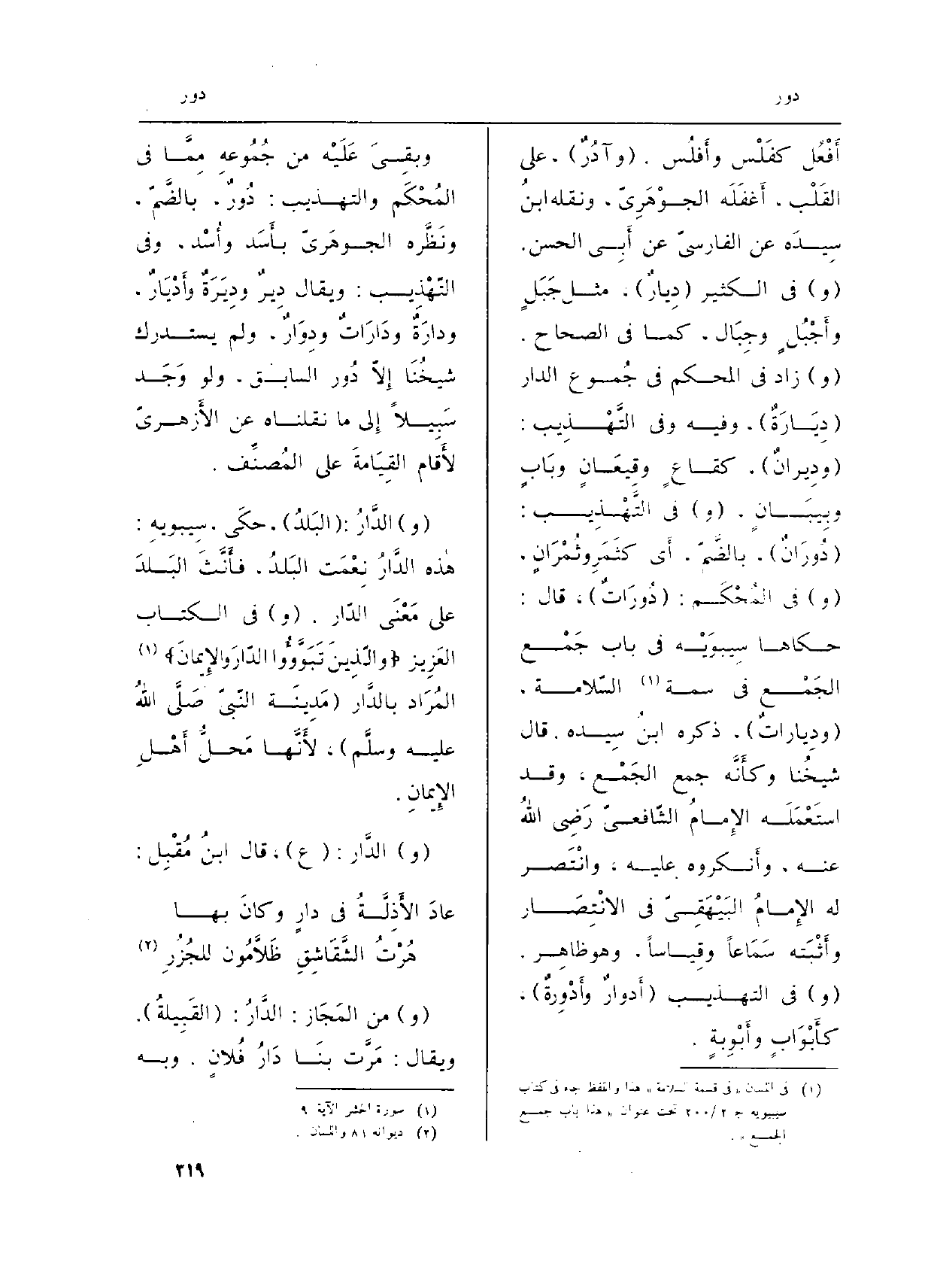 (و) {الدَّارُ: (البَلدُ) ، حكَى، سِيبويهِ: هاذه الدَّارُ نِعْمَت البَلدُ، فأَنَّثَ البَلدَ على مَعْنَى الدّار. (و) فِي الْكتاب العَزِيز {) 1 (. 019 وَالَّذين تبووؤا الدَّار وَالْإِيمَان} (الْحَشْر: 9) المُرَاد} بالدَّار (مَدِينَة النّبيّ صلى الله عَلَيْهِ وَسلم، لاٌّ هَا مَحلُّ أَهْلِ الإِيمانِ.