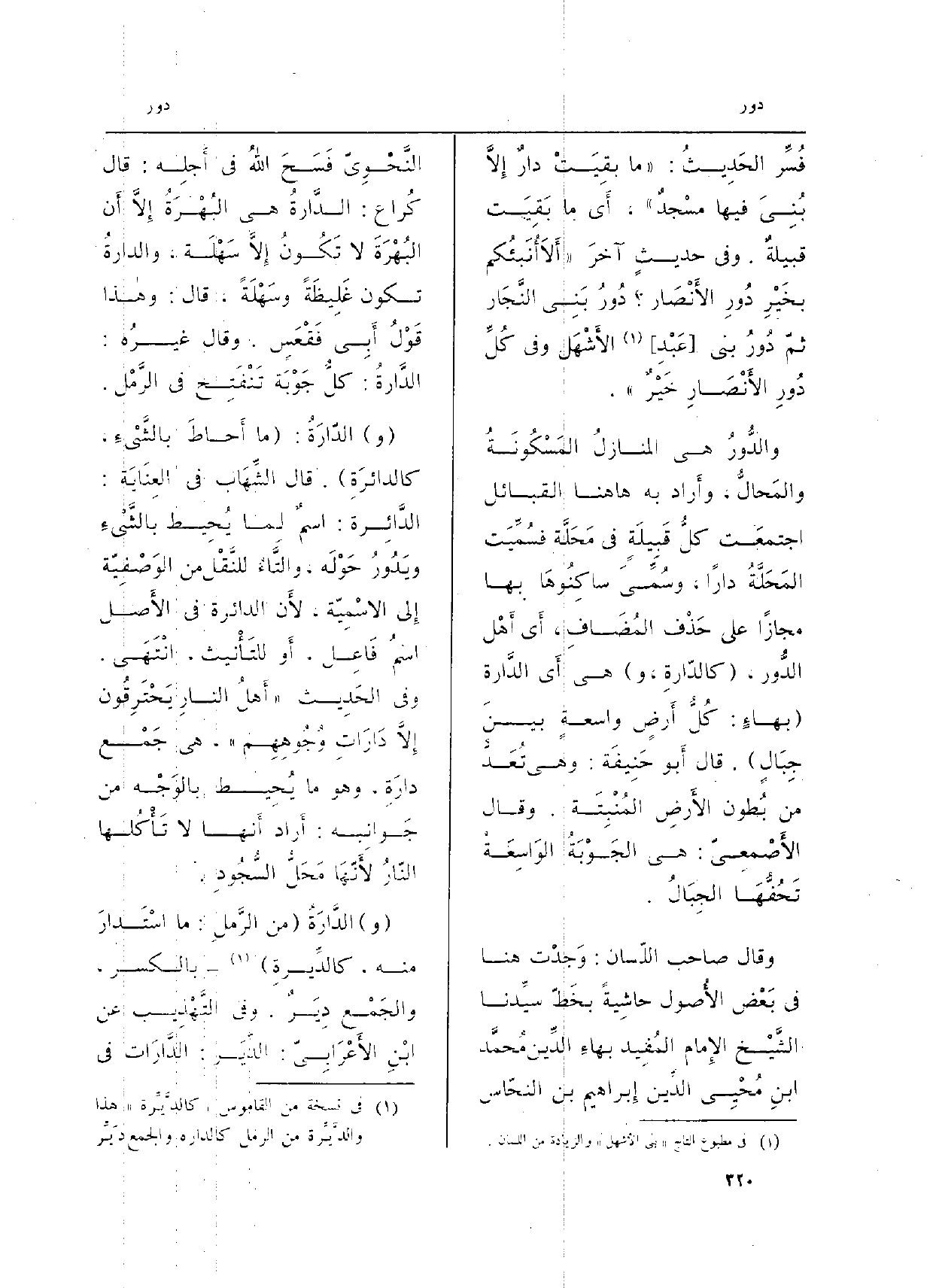 فُسِّر الحَدِيثُ: (مَا بقِيَتْ دارٌ إلاَّ بُنِيَ فِيهَا مسْجدٌ) ، أَي مَا بَقِيَت قبيلةٌ. وَفِي حديثٍ آخرَ (أَلاَ أُنَبئُكم بخَيْرِ دُورِ الأَنْصَار؟ دُورُ بَنِي النَّجَار ثمّ دُورُ بني (عَبْدِ) الأَشْهَل وَفِي كُلِّ {دُورِ الأَنْصَارِ خَيْرٌ) .} والدُّورُ هِيَ المنازلُ المَسْكُونَةُ والمَحالُّ، وأَراد بهَا هُنَا الْقَبَائِل اجتمعَت كلُّ قَبِيلَةٍ فِي مَحَلَّة فسُمِّيَت المَحَلَّةُ {دَارا، وسُمِّيَ ساكِنُوهَا بهَا مجَازًا على حَذْف المُضَافِ، أَي أَهْل} الدُّور، ( {كالدّارةِ، و) هِيَ أَي الدَّارة (بهاءٍ: كُلُّ اآضٍ واسعةٍ بينَ جِبَالٍ) . قَالَ أَبو حَنِيفَة: وَهِي تُعَدُّ من بُطون الأَرض المُنْبِتَة. وَقَالَ الأَصْمعيّ: هِيَ الجَوْبَةُ الوَاسِعَةُ تَحُفُّهَا الجِبَالُ.