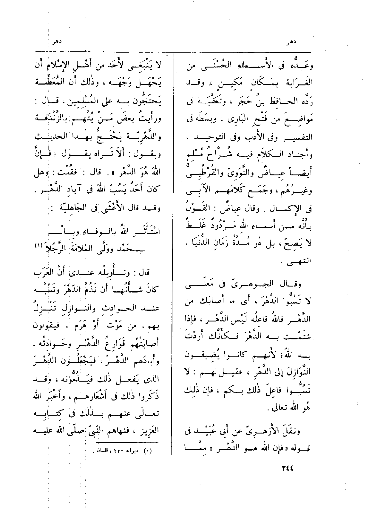 ونقَلَ الأَزهرِيّ عَن أَبي عُبَيْد فِي قَوْله: (فإِن الله هُوَ الدَّهْر) مِمَّا لَا يَنْبَغِي لأَحَد من أَهْلِ الإِسْلام أَن يَجْهَل وَجْهَه، وذالك أَن المُعَطِّلة يَحتَجُّون بِهِ على المُسْلِمِين، قَالَ: ورأَيتُ بعضَ مَنْ يُتَّهم بالزَّنْدَقة والدَّهْرِيّة يَحْتَجُّ بهاذا الحَدِيث وَيَقُول: أَلاَ تَراه يَقُول: (فإِنَّ اللَّهَ هُوَ الدَّهْر) . قَالَ: فقُلتُ: وَهل كَانَ أَحَدٌ يَسُبُّ اللَّهَ فِي آبادِ الدَّهْر. وَقد قَالَ الأَعْشَى فِي الجَاهِليّة: