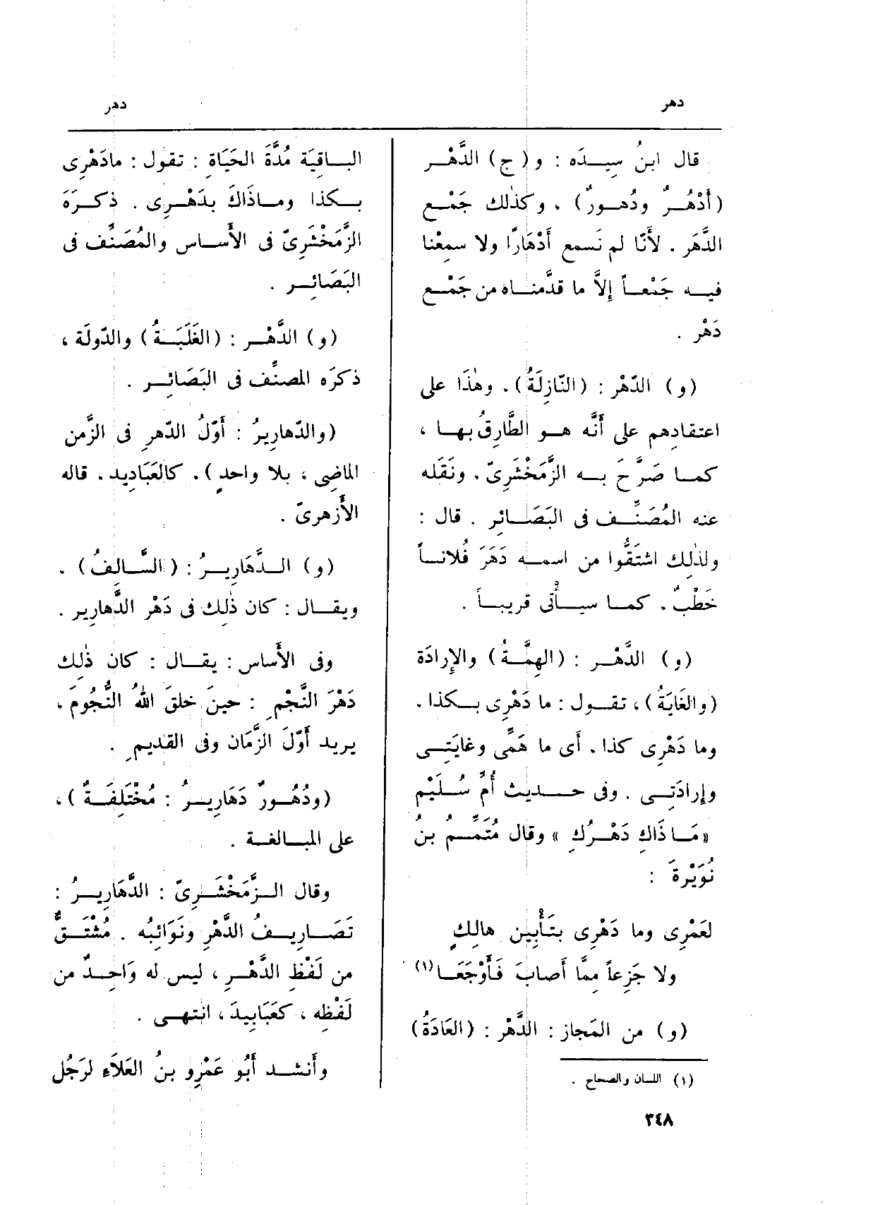 وَقَالَ الزَّمَخْشَرِيّ: الدَّهَارِيرُ: تَصَارِيفُ الدَّهْر ونوَائِبُه. مُشْتَقٌّ من لَفْظِ الدَّهْرِ، لَيْسَ لَهُ وَاحِدٌ من لَفْظِه، كعَبَابِيدَ، انْتهى.
