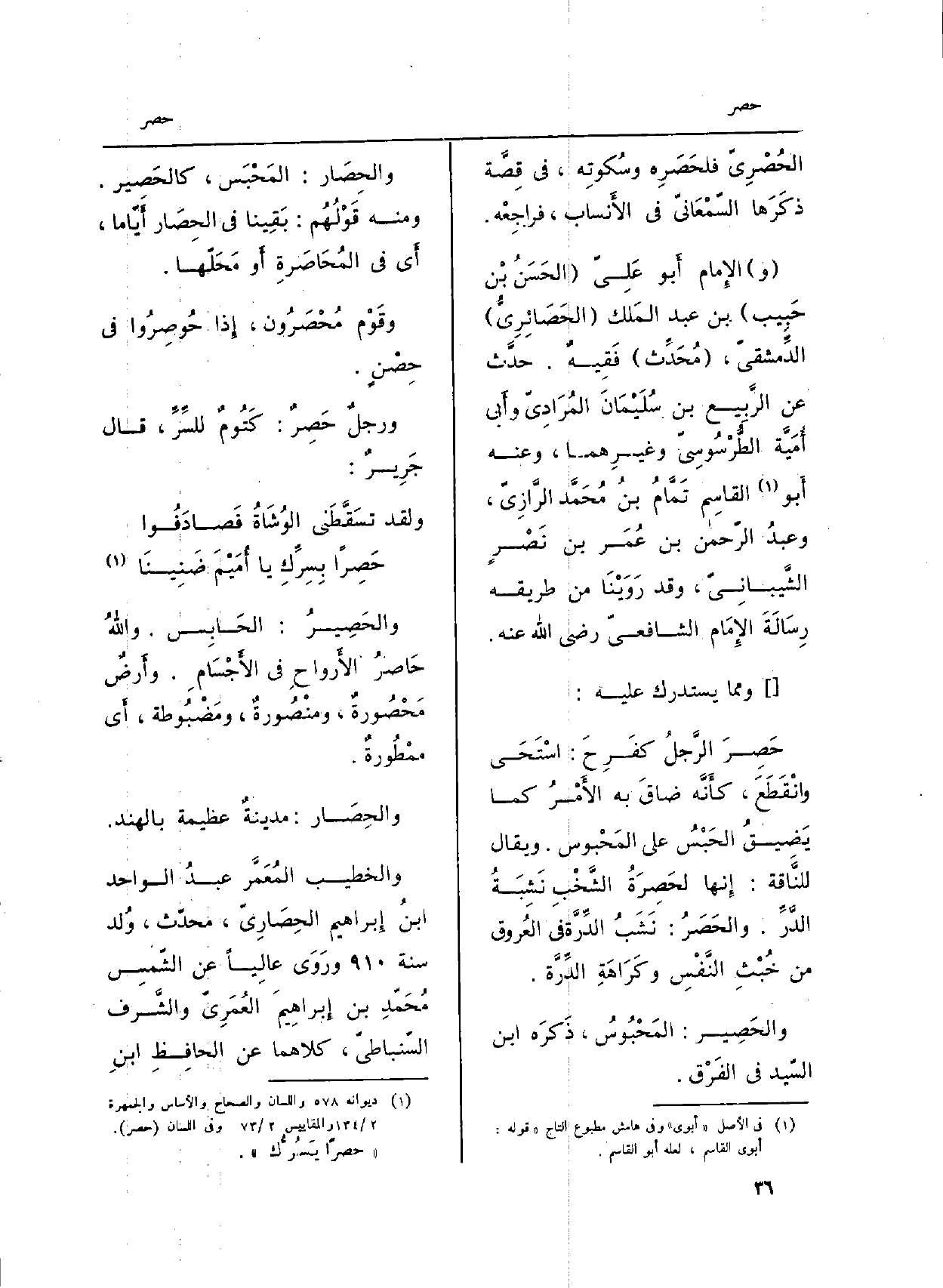 الحُصْرِيّ فلحَصَرِه وسُكوته، وَفِي قِصَّة ذكَرَهَا السّمْعَانِيّ فِي الأَنساب، فراجِعْه.
