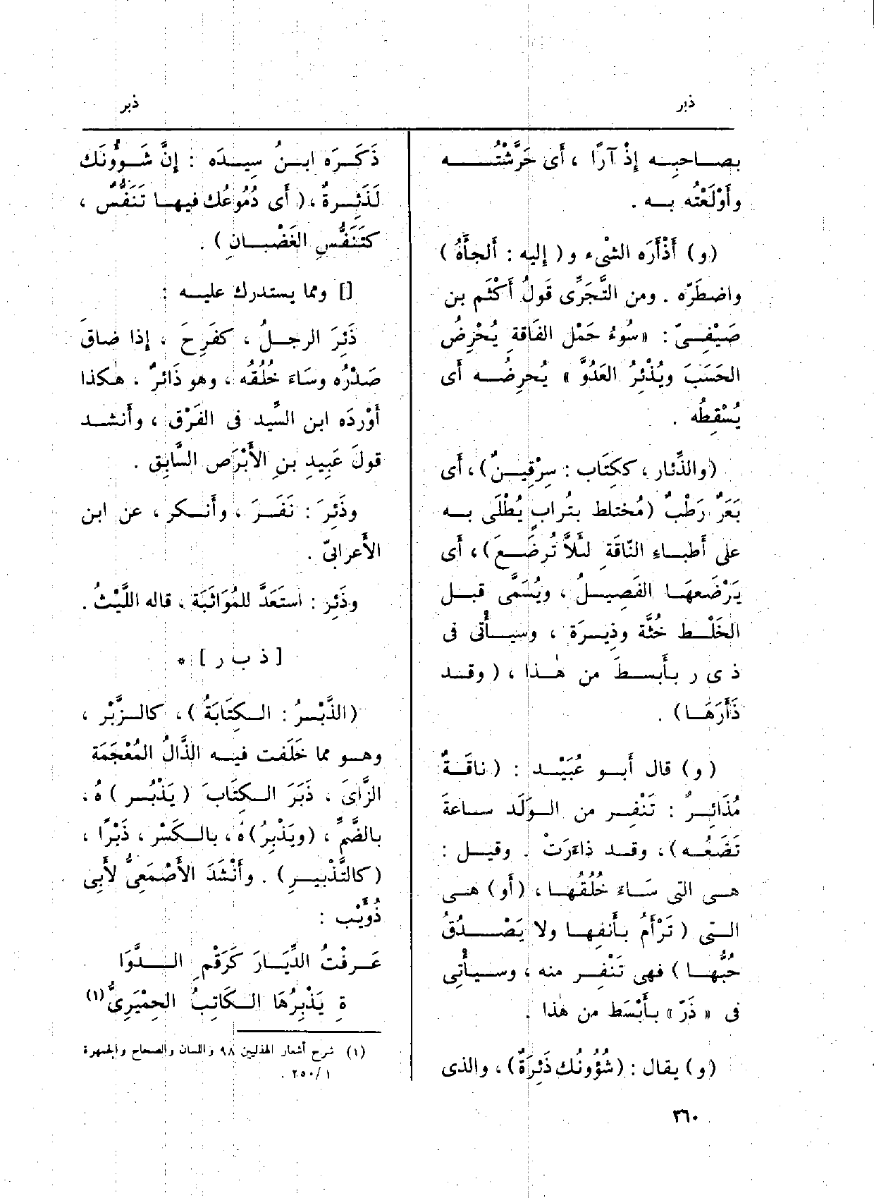 : (الذَّبْرُ: الكِتَابَةُ) ، كالزَّبْر، وَهُوَ مِمَّا خَلَفت فِيهِ الذَّالُ المُعْجَمَة الزَّايَ، ذَبَرَ الكِتَابَ (يَذْبُر) هُ، بالضَّمِّ، (ويَذْبِرُ) هُ، بالكَسْر، ذَبْراً، (كالتَّذْبِيرِ) . وأَنْشَدَ الأَصْمَعِيُّ لأَبِي ذُؤَيْب: