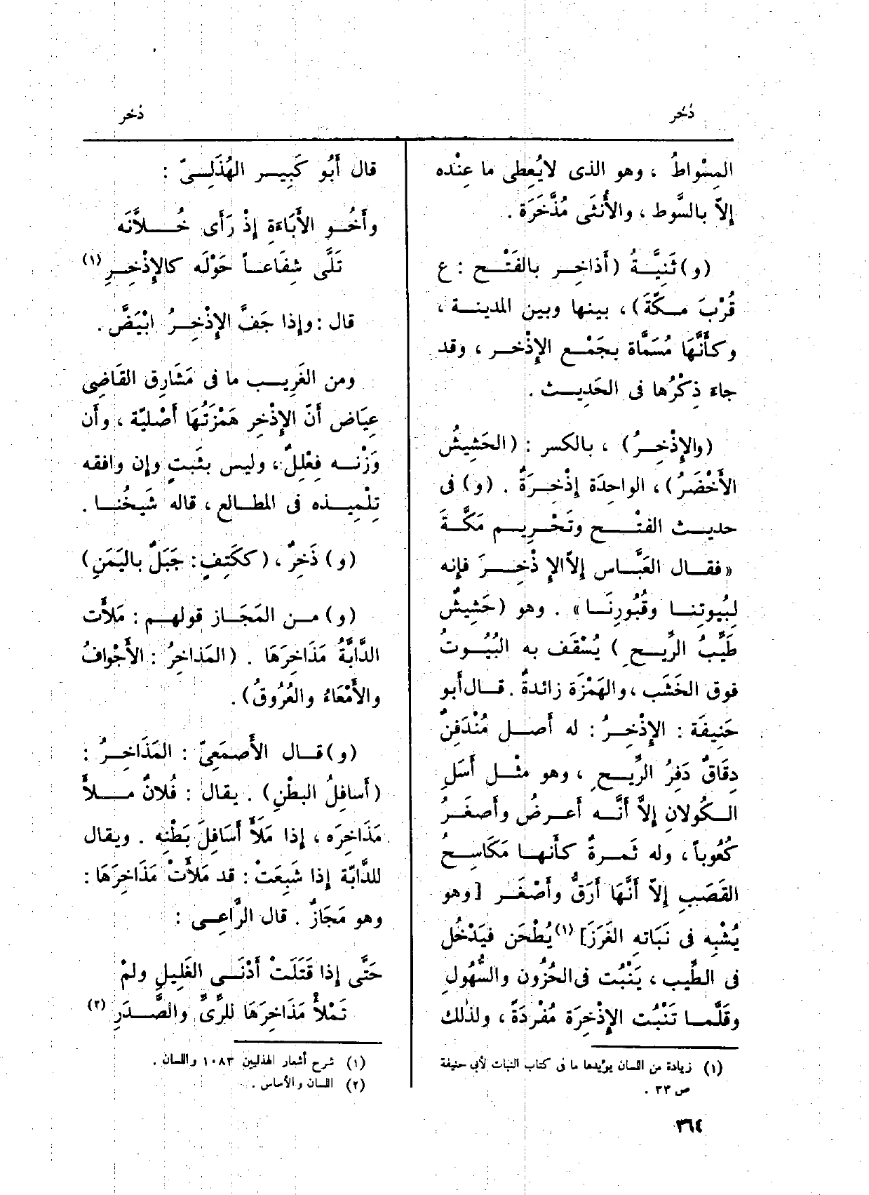 (والإِذْخِرُ) ، بِالْكَسْرِ: (الحَشِيشُ الأَخْضَرُ) ، الواحِدَةِ إِذْخرَةٌ. (و) فِي حَدِيث الفتْح وتَحْرِيم مَكَّةَ (فَقَالَ العَبَّاس إِلّا الإِذْخِرَ فإِنه لِبُيوتنا وقُبُورِنَا) . وَهُوَ (حَشِيشٌ طَيِّبُ الرِّيحِ) يُسْقَف بِهِ البُيُوتُ فَوق الخَشَرب، والهَمْزَة زائدةٌ. قَالَ أَبو حَنِيفَة: الإِذْخِرُ: لَهُ أَصل مُنْدَفِنٌ دِقَاقٌ دَفِرُ الرِّيحِ، وَهُوَ مثْل أَسَلِ الكُولانِ إِلَّا أَنَّه أَعرضُ وأَصغَرُ كُعُوباً، وَله ثَمرةٌ كأَنها مَكَاسِحُ القَصَبِ إِلّا أَنَّهَا أَرَقُّ وأَصْغَر (وَهُوَ يُشْبِه فِي نَبَاتِه الغَرَزَ) يُطْحَن فيَدْخُل فِي الطِّيب، يَنْبُت فِي الحُزُون والسُّهُولِ وقَلَّما تَنْبُت الإِذْخِرَة مُفْردَةً، ولذالك قَالَ أَبُو كَبِير الهُذَلِيّ: