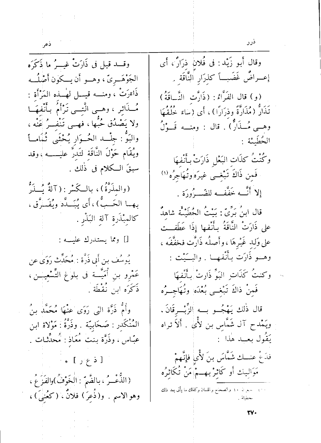 قَالَ ابنُ بَرِّيّ: بَيْتُ الحُطَيْئَة شاهِدٌ على ذَارَتْ النَّاقَةُ بأَنْفها إِذَا عَطَفت على وَلِدِ غَيْرِهَا، وأَصلُه {ذَارَّت فخفَّفَه، وَهُوَ} ذَارَت بأَنْفها. والبَيْت: