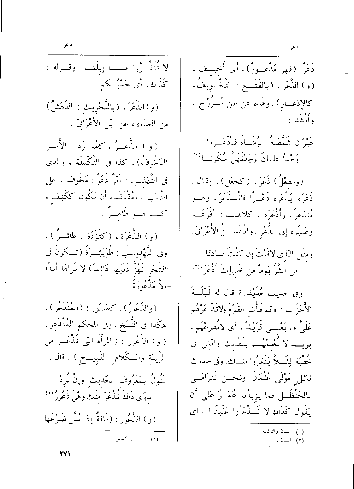 وَفِي حَدِيث حُذَيْفة قَالَ لَهُ لَيْلَةَ الأَحْزَاب: (قُم فَأْتِ القَوْمَ وَلَا تَذْعَرْهُم عَلَيَّ) ، يَعْنِي قُرَيْشاً، أَي لَا تُفزِعْهُم، يُرِيد لَا تُعْلِمْهُم بنَفْسِك وامْشِ فِي خُفْيَة لِئَلاَّ يَنْفِرُوا مِنْك. وَفِي حَدِيث نائلٍ مَوْلَى عُثْمَانَ (وَنحن نَتَرَامَى بالحَنْظَل فَمَا يَزِيدُنا عُمَرُ عَلى أَن يَقُول كَذَاكَ لَا تَذْعَرُوا عَلَيْنَا) ، أَي لَا تُنَفِّرُوا علينا إِبِلَنا. وَقَوله: كَذَاك، أَي حَسْبُكم.