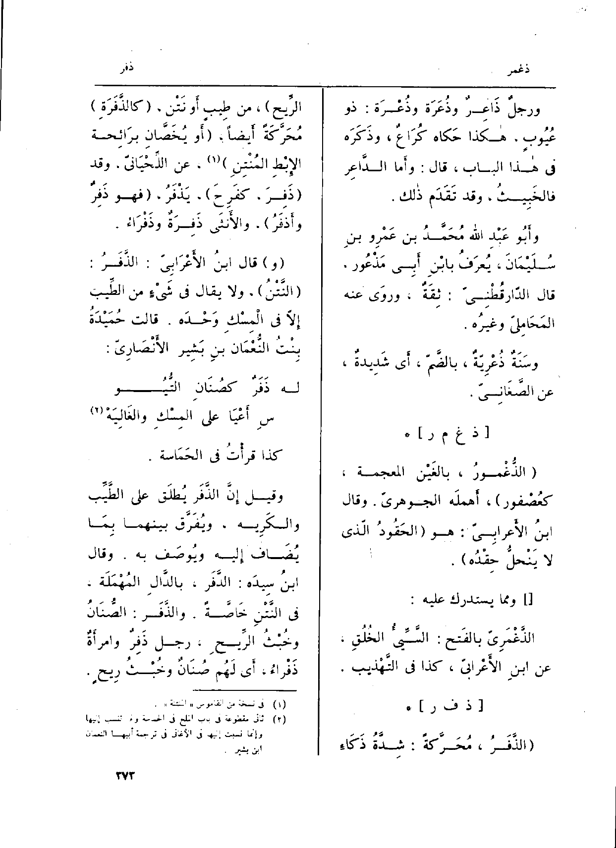 وَقيل إِنَّ الذَّفَر يُطلَق على الطَّيِّب والكَرِيه، ويُفَرَّق بَينهمَا بِمَا يُضَاف إِليه ويُوصَف بِهِ. وَقَالَ ابنُ سِيدَه: الدَّفَر، بالدَّالِ المُهْمَلَة، فِي النَّتْنِ خَاصَّةً. والذَّفَر: الص 2 انُ وخُبْثُ الرِّحيِ، رجل ذَفِرٌ وامرأَةٌ ذَفْرَاءُ، أَي لَهُم صُنَانٌ وخُبْثُ رِيحٍ.