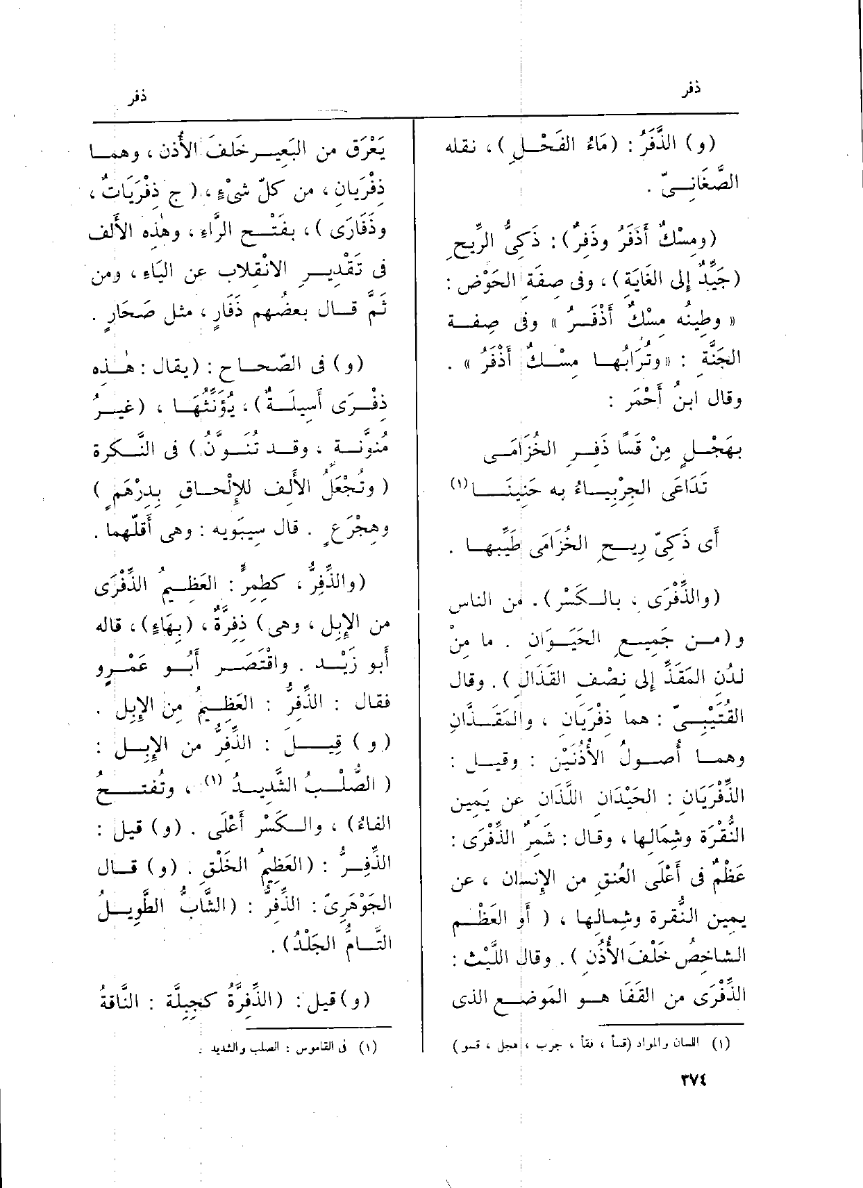 (والذِّفِرُّ، كطِمِرَ: العَظِيمُ الذِّفْرَى من الإِبِل، وَهِي) ذِفِرَّةٌ، (بِهَاءٍ) ، قَالَه أَبو زَيْد. واقْترَ أَبُو عَمْرٍ وفقال: الذِّفِرُّ: العَظِيمُ مِن الإِبِل. (و) قِيلَ: الذِّفِرُّ من الإِبِل: (الصُّلْبُ الشَّدِيدُ، وتُفتحُ الفاءُ) ، والكَسْر أَعْلَى. (و) قيل: الذِّفِرُّ: (العَظِيمُ الخَلْقِ) . (و) قَالَ الجَوْهَرِيّ: الذِّفِرُّ: (الشَّابُّ الطَّوِيلُ التَّامُّ الجَلْدُ) .