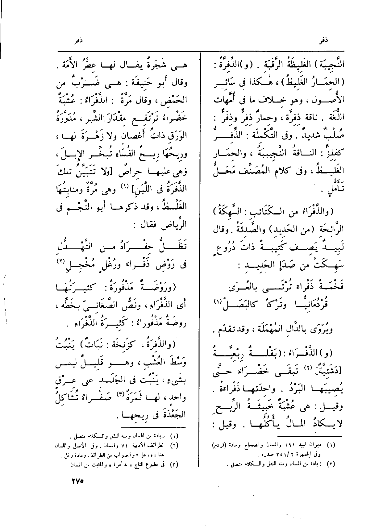 (و) الذَّفْرَاءُ: (بَقْلةٌ رِبْعِيَّةٌ) (دَشَتِيَّةٌ) تَبقَى خَضْرَاءَ حتَّى يُصِيبَها البَرْدُ. واحِدَتها ذَفْراءَةُ. وَقيل هِيَ عُشْبَةٌ خَبِيثَة الرِّيحِ لَا يكادُ المالُ يأْكُلُها. وَقيل: هِيَ شَجَرَةٌ يُقَال لَهَا عِطْرُ الأَمَة. وَقَالَ أَبو حَنِيفَة: هِيَ ضَرْبٌ من الحَمْضِ، وَقَالَ مَرَّةً: الذَّفْرَاءُ: عُشْبَةٌ خَضْراءُ تَرْتَفِع مِقْدَارَ الشِّبر، مُدَوَّرَةُ الوَرَقِ ذَاتُ أَغصانٍ وَلَا زَهْرَةَ لَهَا، ورِيحُهَا رِيحُ الفُسَاءِ تُبخِّر الإِبلَ، وَهِي عَلَيْهَا حِراصٌ (وَلَا تَتَبَيَّنُ تلكَ الذَّفَرَةُ فِي اللَّبَنِ) وَهِي مُرَّةٌ ومنابِتُهَا الغَلْظُ، وَقد ذكرهَا أَبو النَّجْم فِي الرِّياض فَقَالَ: