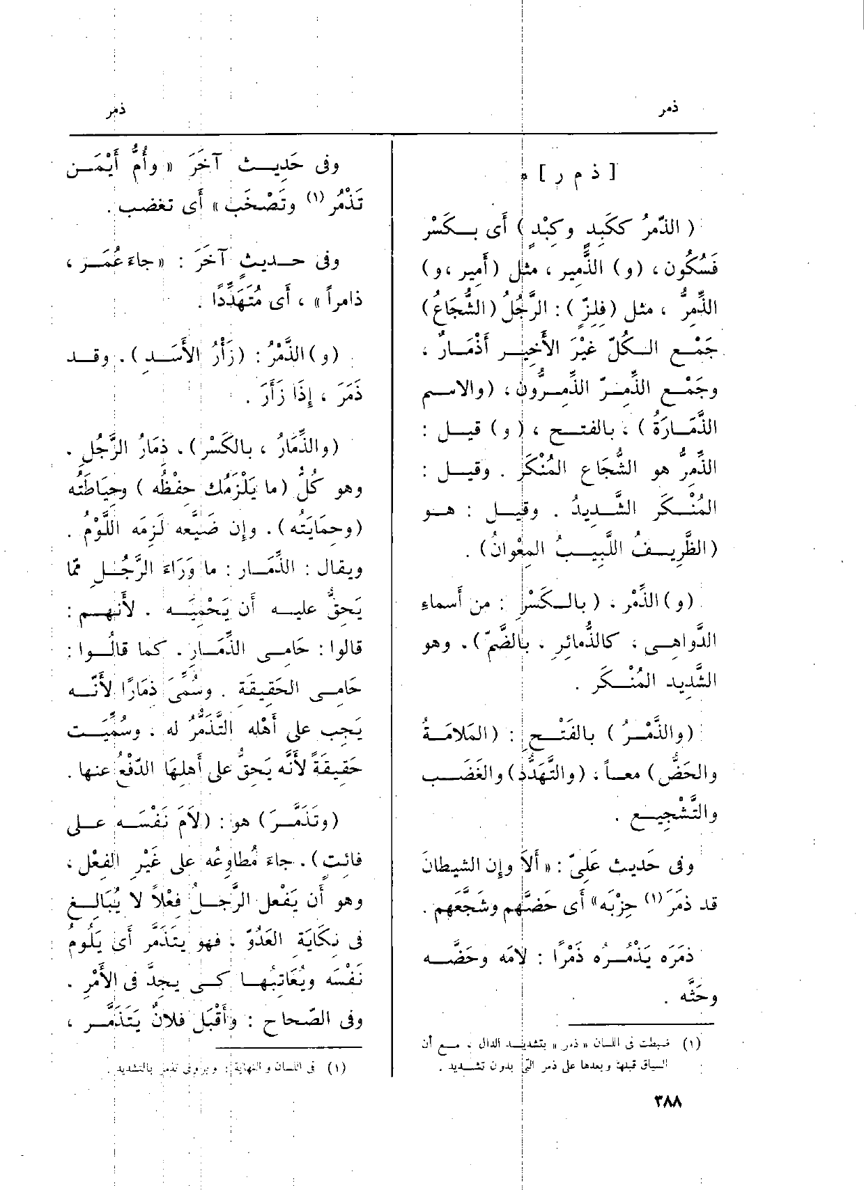: (الذّمرُ ككَبِد وكِبْدٍ) أَي بكَسْر فَسُكُون، (و) الذَّمِير، مثل (أَمِير، و) الذِّمِرُّ، مثل (فِلِزَ) : الرَّجلُ (الشُّجَاعُ) جَمْع الكُلّ غيْرَ الأَخِير أَذْمَارٌ، وجَمحع الذِّمِرّ الذِّمِرُّون، (وَالِاسْم الذَّمارةُ) ، بِالْفَتْح، (و) قيل: الذِّمِرُّ هُوَ الشُّجاع المُنْكَر. وَقيل: المُنْكَر الشَّدِيدُ. وَقيل: هُوَ (الظَّرِيفُ اللَّبِيبُ المِعْوانُ) .