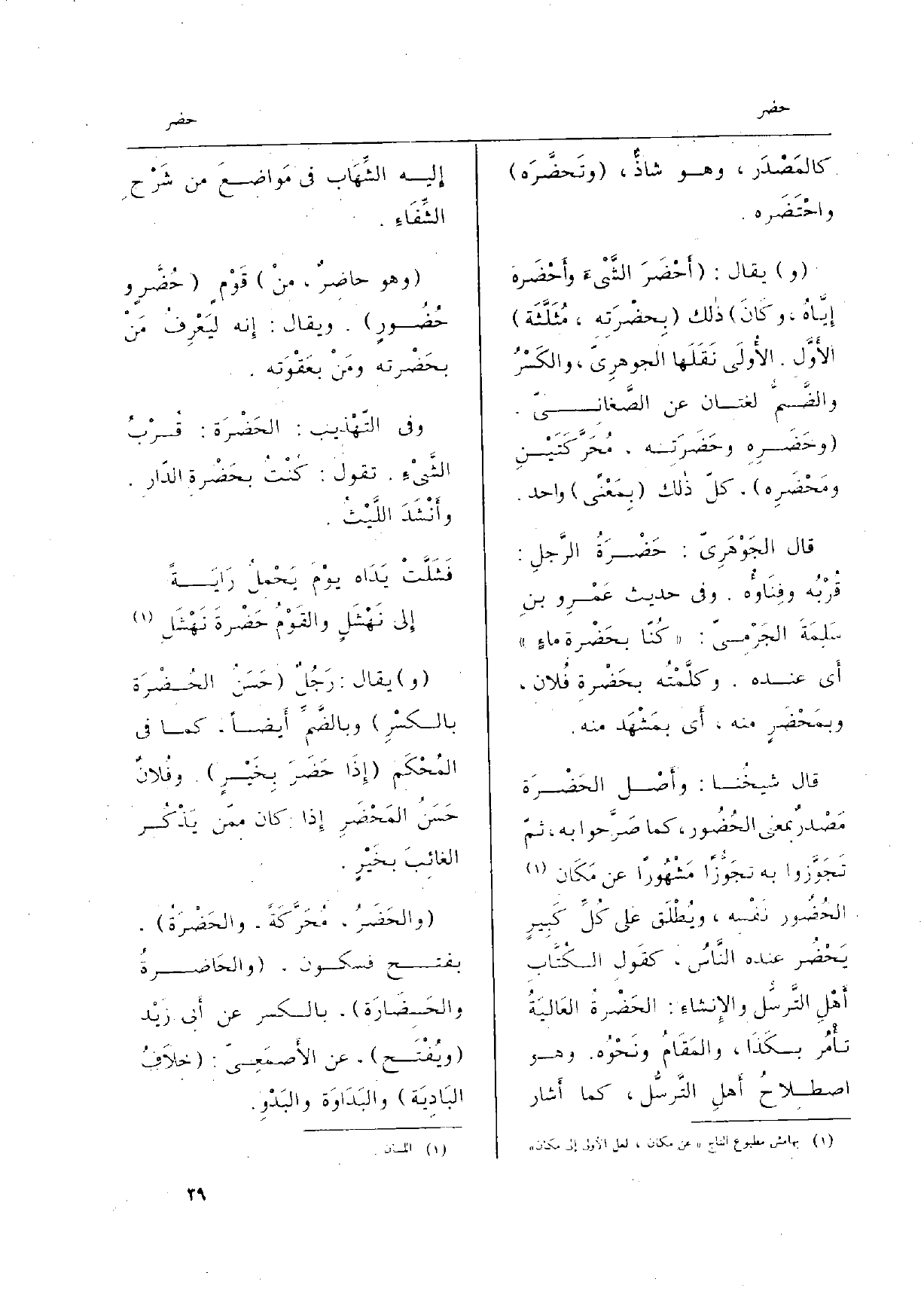 قَالَ الجَوْهَرِيّ: حَضْرَةُ الرَّجلِ: قُرْبُه وفِنَاؤه. وَفِي حَدِيث عَمْرِو بنِ سَلِمَةَ الجَرْمِيّ: (كُنّا بحَضْرةِ ماءٍ) أَي عِنْده. وكلَّمْتُه بحَضْرَةِ فُلان، وبمَحْضَرٍ مِنْهُ، أَي بمَشْهَد مِنْهُ.