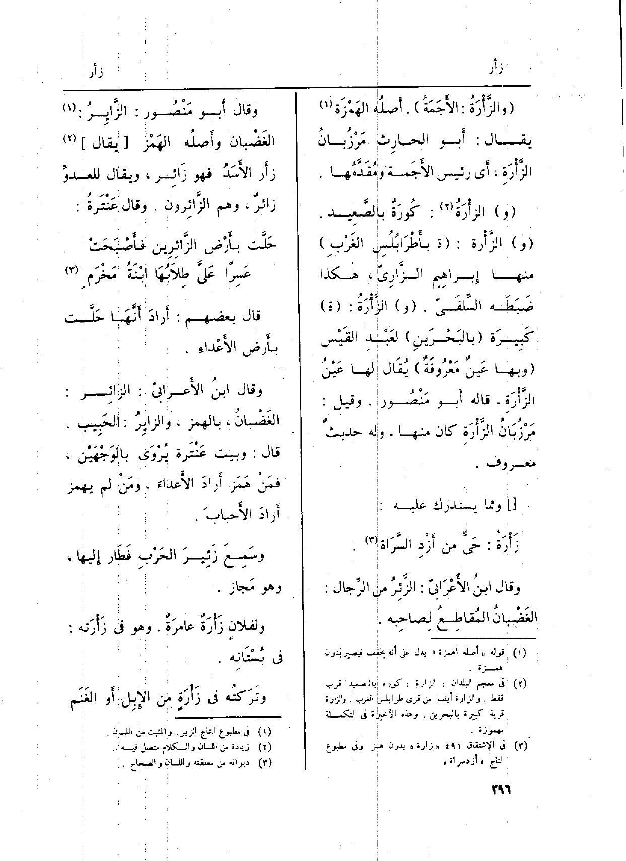 وَقَالَ أَبو مَنْصُور: الزَّايِرُ: الغَضْبان وأَصلُه الهَمْز (يُقَال) } زأَر الأَسَدُ فَهُوَ {زَائِر، وَيُقَال للعدوِّ} زائرٌ، وهم {الزَّائِرون. وَقَالَ عَنْتَرةُ:
