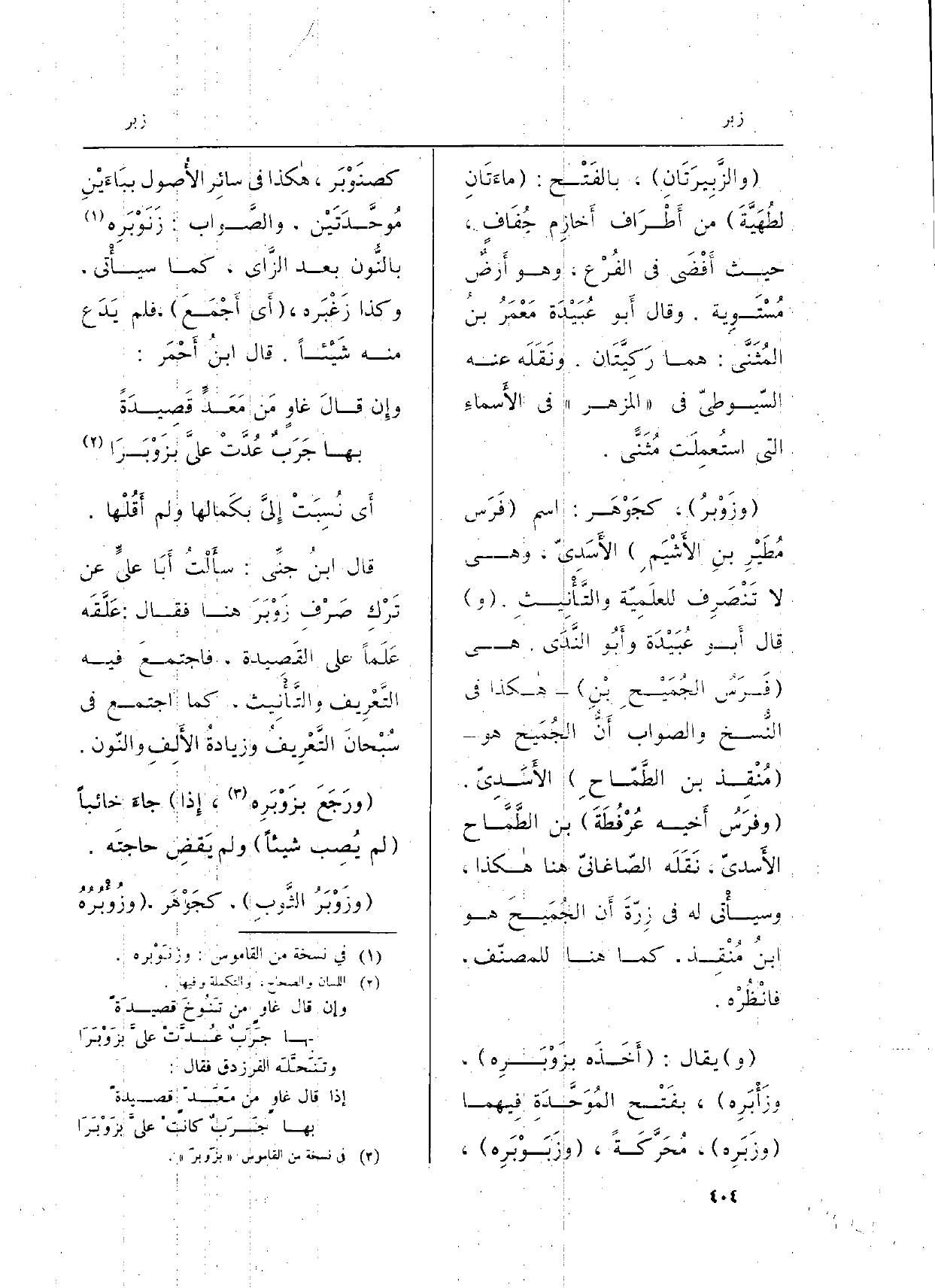 قَالَ ابنُ جُنِّي: سأَلْتُ أَبَا عَليَ عَن تَرْكِ صَرْفِ زَوْبَرَ هُنَا فَقَالَ: عَلَّقَه عَلَماً على القَصِيدة، فاجتمعَ فِيهِ التَّعْرِيف والتَّأْنِيث، كَمَا اجْتمع فِي سُبْحانَ التَّعْرِيفُ وزيادةُ الأَلِفِ والنّون.