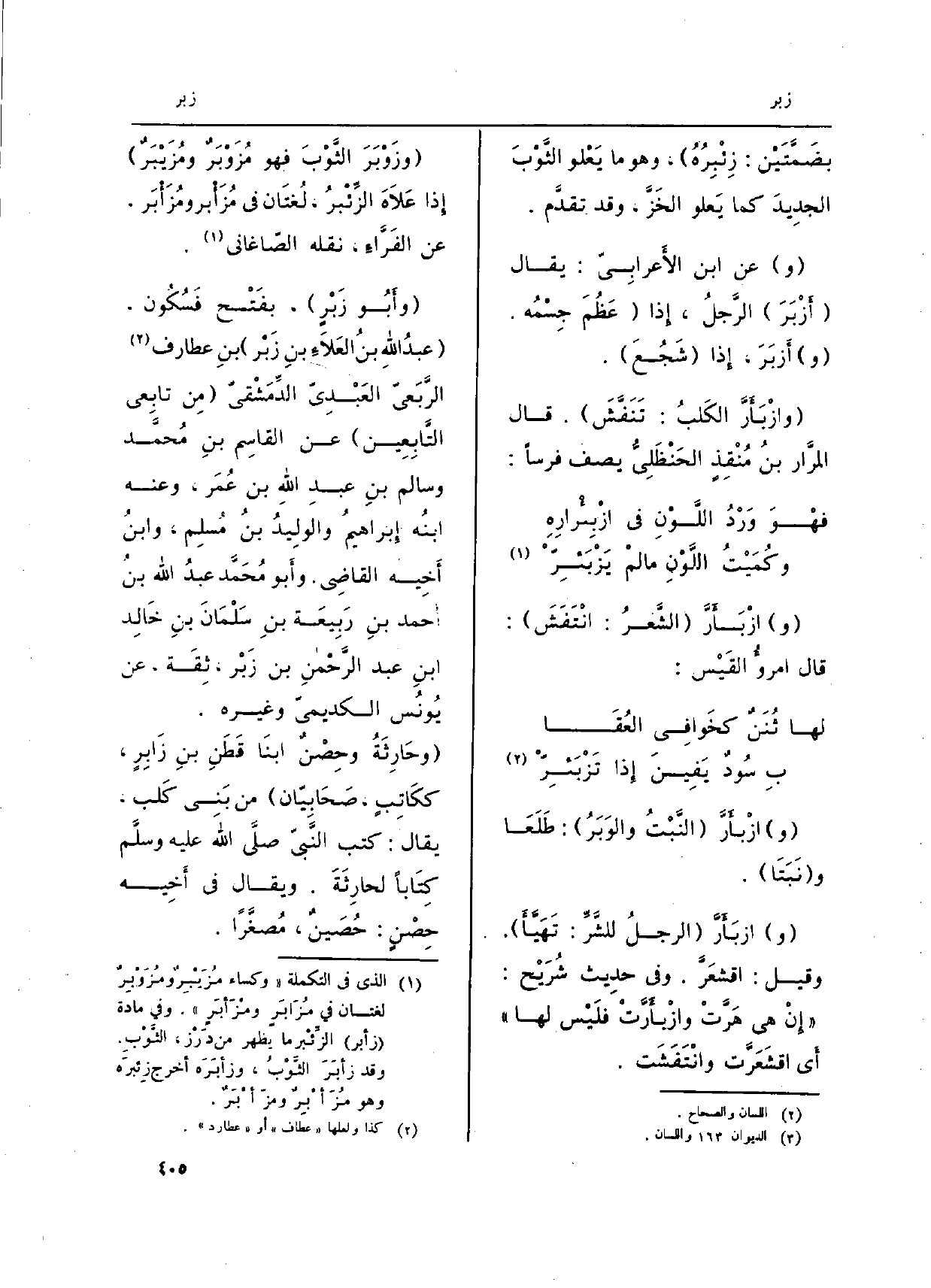 (وزَوْبَرَ الثَّوْبَ فَهُوَ مُزَوْبَرٌ ومُزَيْبَرٌ) إِذا عَلاَهَ الزِّئْبَرُ، لُغتَان فِي مُزَسبر ومُزَأْبَر، على الفَرَّاءِ، نَقله الصّاغاني.