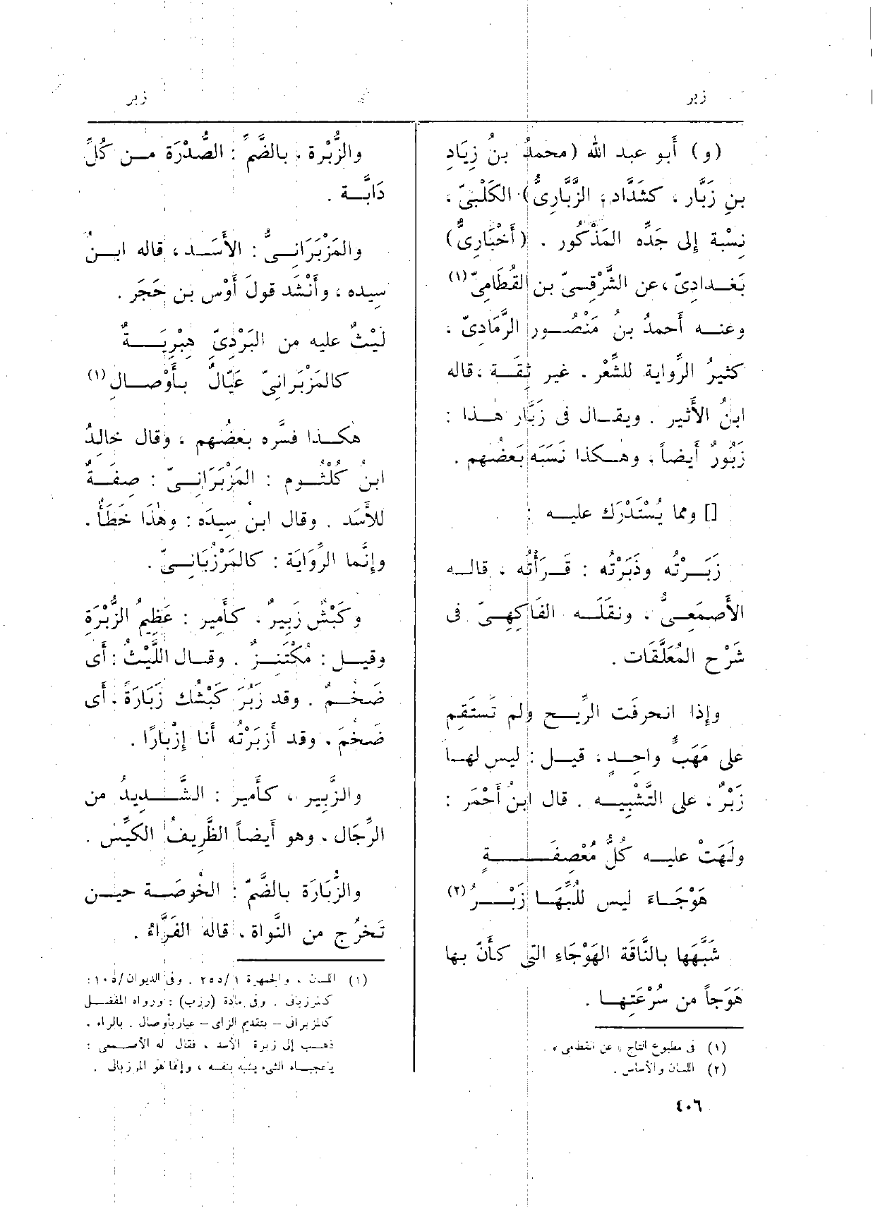 (و) أَبو عبد الله (محمدُ بنُ زِيَادِ بنِ زَبَّار، كشَدَّاد، الزَّبَّارِيُّ) الكَلْبِيّ، نِسْبة إِلى جَدِّه المَذْكُور، (أَخْبَارِيٌّ) بَغدادِيّ، عَن الشَّرْقِيّ بن القُطَامِي وَعنهُ أحمدُ بنُ مَنْصُور الرَّمَادِيّ، كثيرُ الرِّواية للشِّعْر، غير ثِقَة، قَالَه ابنُ الأَثيير. وَيُقَال فِي زَبَّار هاذا: زَبُورٌ أَيضاً، وهاكذا نَسَبَه بَعضهم.