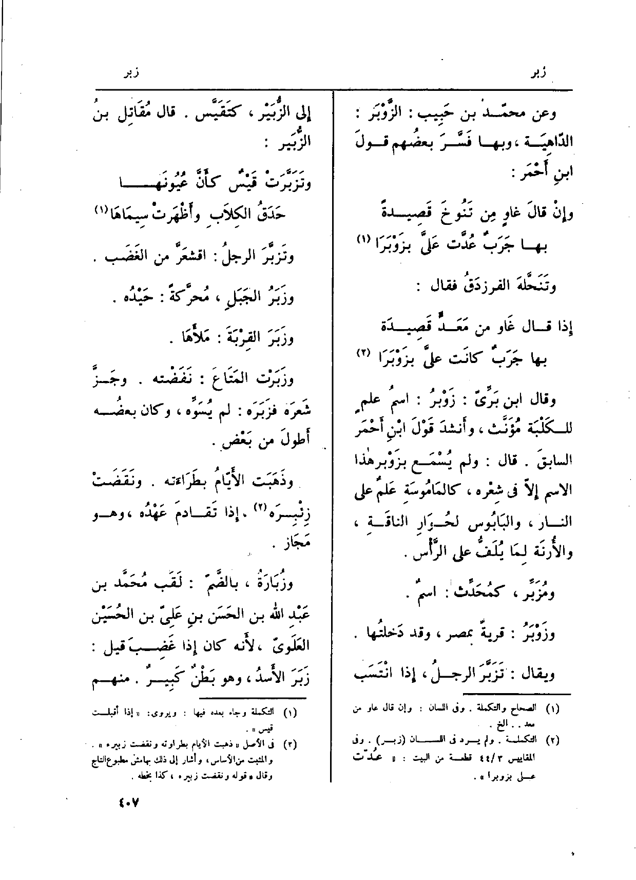 وَقَالَ ابْن بَرِّيّ: زَوْبَرُ: اسمُ علمٍ للكَلْبَة مُؤَنَّث، وأَنشدَ قَوْلَ ابْنِ أَحْمَر السابقَ. قَالَ: وَلم يُسْمَع بزَوْبر هاذا الِاسْم إِلّا فِي شِعْره، كالمَامُوسَةِ عَلمٌ على النَّار، والبَابُوس لحُوَارِ الناقَةِ، والأُرنَة لِمَا يُلَفُّ على الرَّأْس.