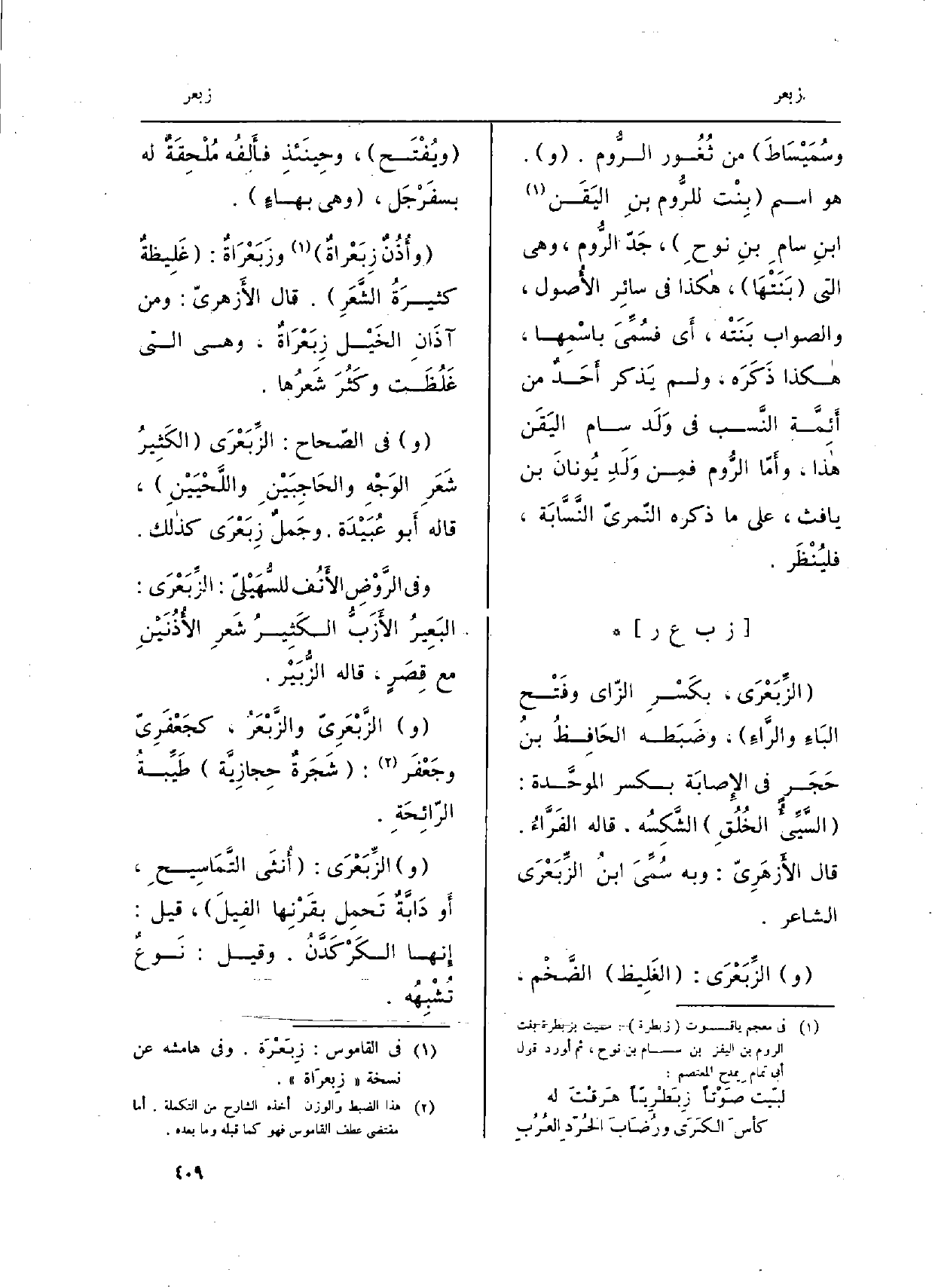 (و) فِي الصّحاح: الزِّبَعْرَى (الكَثِيرُ شعرِ الوَجْهِ والحَاجِبَيْنِ واللَّحْيَيْنِ) ، قَالَه أَبو عُبَيْدَة. وجَملٌ زِبَعْرَى كذالك.