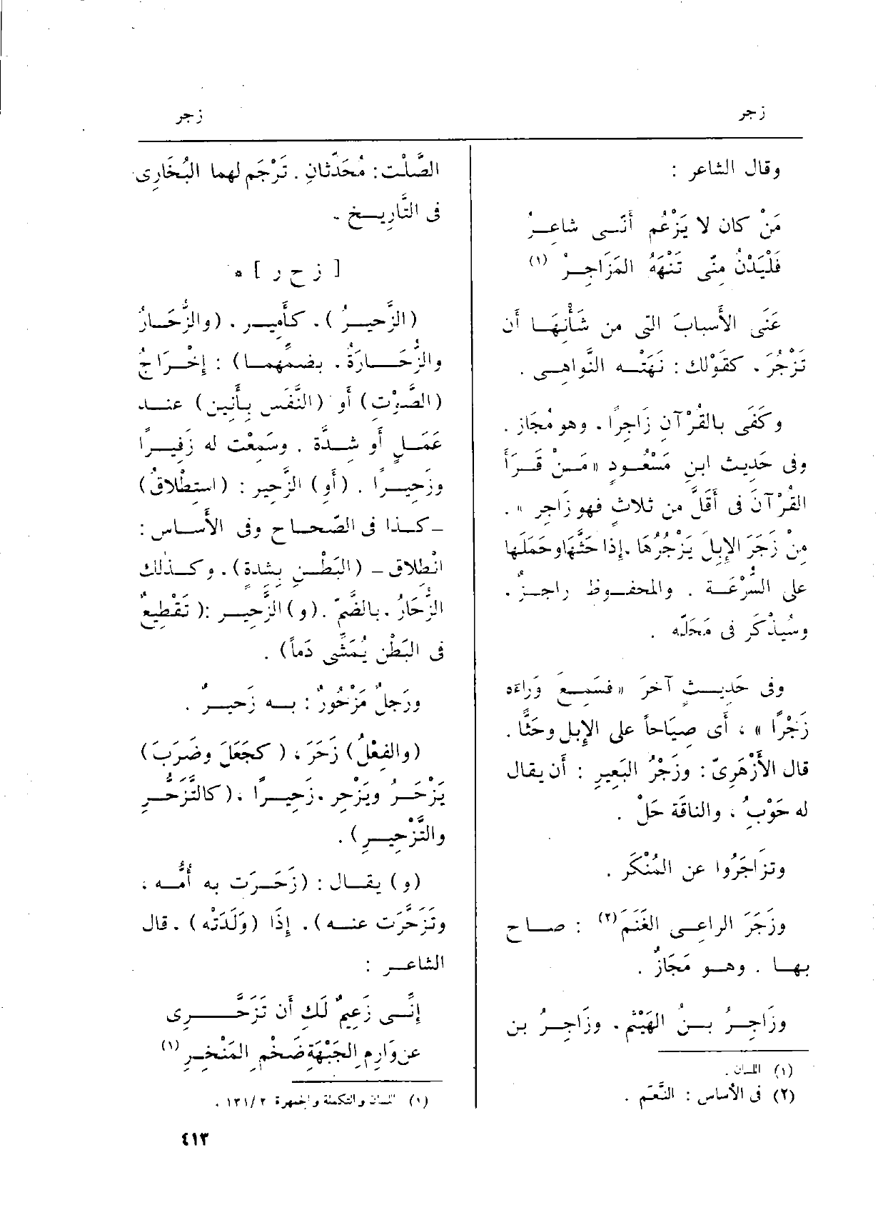 وكَفَى بالقُرْآنِ زَاجِراً، وَهُوَ مُجَاز. وَفِي حَدِيث ابنِ مَسْعُودٍ (مَنْ قَرَأَ القُرْآنَ فِي أَقَلَّ من ثلاثٍ فَهُوَ زَاجِر) . مِنْ زَجَرَ الإِبِلَ يَزْجُرُهَا، إِذا حَثَّهَا وحَمَلَها على السُّرْعَة. وَالْمَحْفُوظ راجزٌ، وسُيذْكَر فِي مَحَلّه.