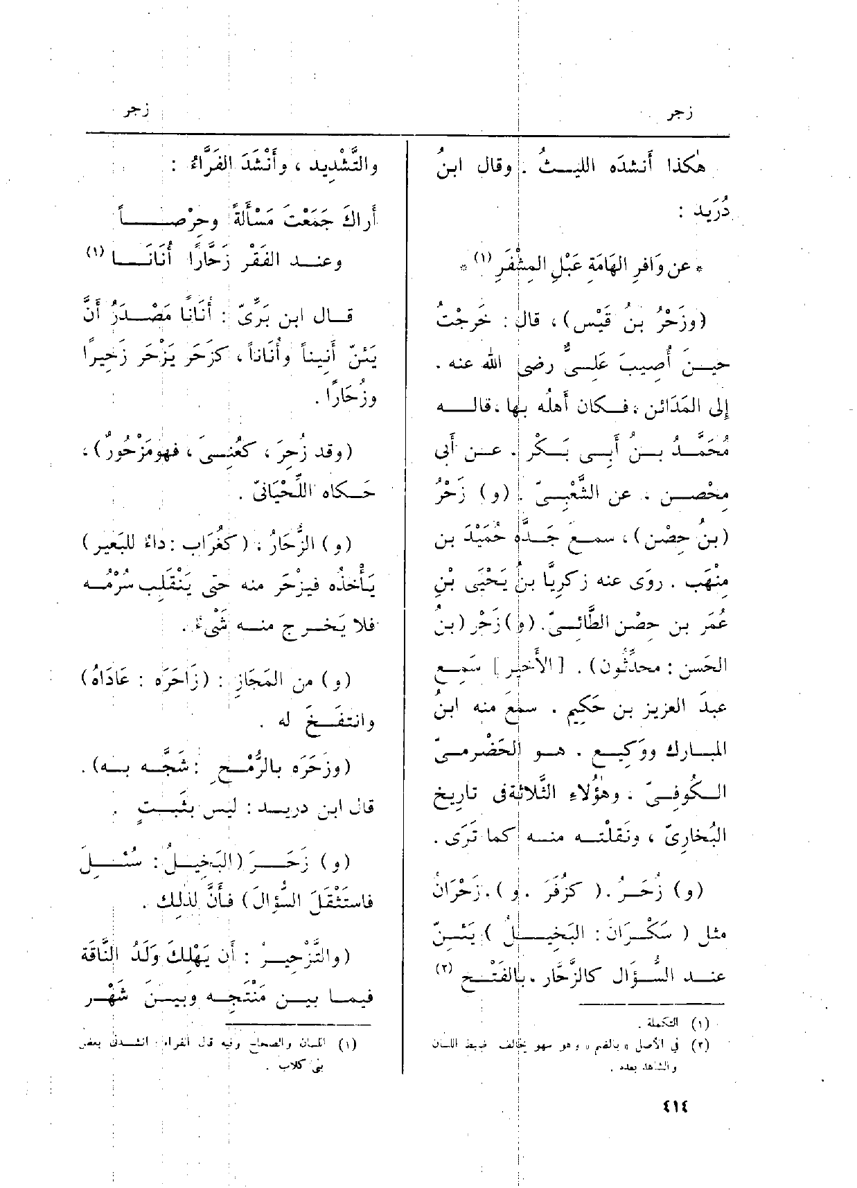 عَن وَافِرِ الهَامَةِ عَبْلِ المِشْفَرِ (وزَحْرُ بنُ قَيْس) ، قَالَ: خَرجْتُ حينَ أُصِيبَ عَلِيٌّ رَضِي الله عَنهُ، إِلَى المَدَائن، فَكَانَ أَهلُه بهَا، قَالَه مُحَمَّدُ بنُ أَبِي بَكْر، عَن أَبي مِحْصن، عَن الشَّعْبِيّ. (و) زَحْرُ (بنُ حِصْن) ، سمعَ جَدَّه حُمَيْدَ بن مِنْهَب. روَي عَنهُ زكرِيَّا بنُ يَحْيَى بْنِ عُمَر ن حِصْن الطَّائِيّ. (و) زَحْر (بنُ الحَسن: محدِّثُون) . (الأَخير) سَمِع عبدَ الْعَزِيز بن حَكِيم، سمعَ مِنْهُ ابنُ الْمُبَارك ووَكِيع، هُوَ الحَضْرميّ الكُوفِيّ، وهاؤلاءِ الثَّلاثة فِي تارِيخ البُخارِيّ، ونَقلْته مِنْهُ كَمَا تَرَى.