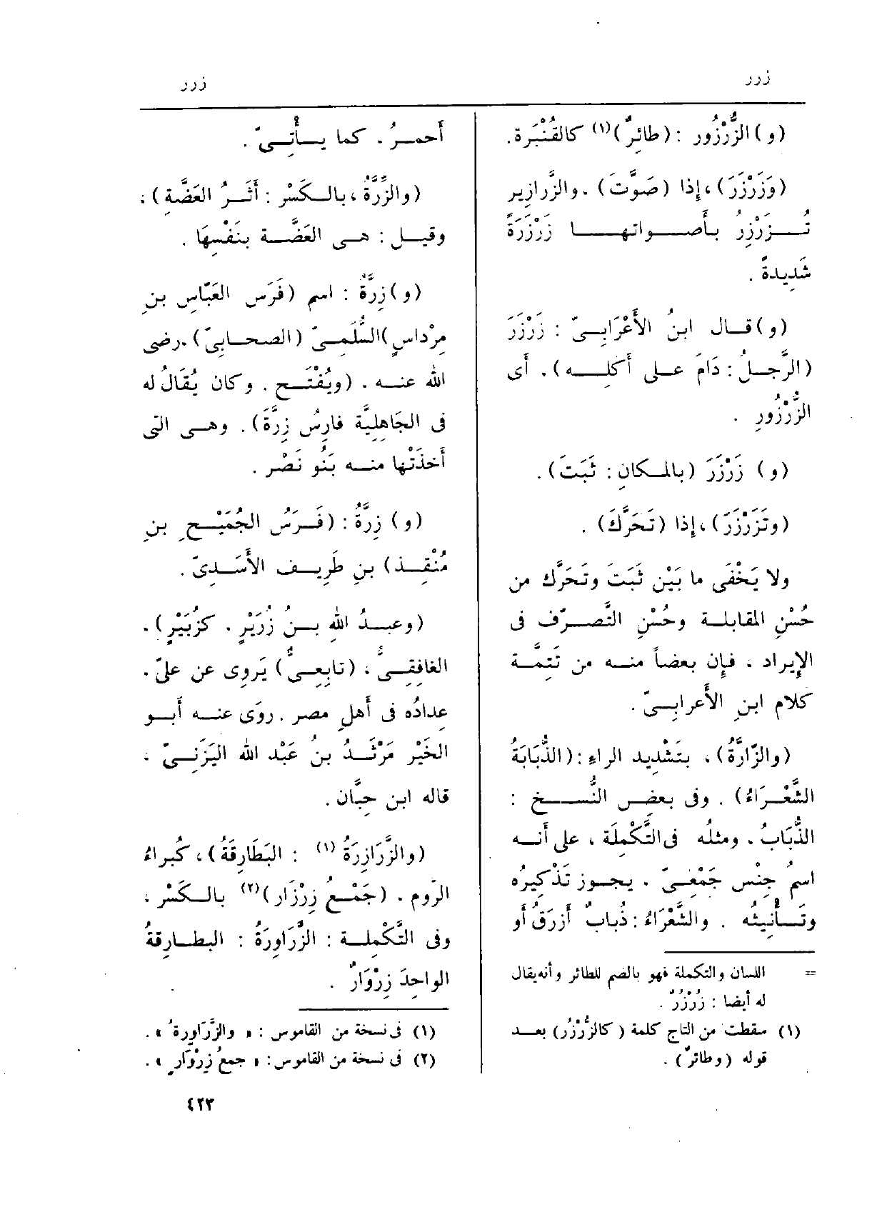 ( {والزَّرَازِرَةُ: البَطَارِقَةُ) ، كُباءُ الرَّوم، (جَمْعُ} زِرْزَار) بالكَسْر، وَفِي التَّكْمِلة: {الزَّرَاوِرَةُ: البطارِقَةُ الواحِدَ} زِرْوَارٌ.