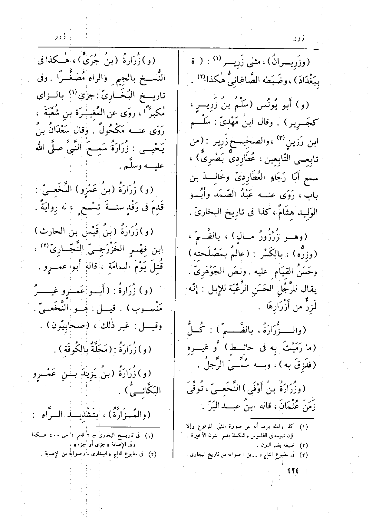 (و) زُرَارةُ: (أَبو عَمرٍ وَغير مَنْسوب) . قيل: هُوَ النَّخَعيّ وَقيل: غير ذالك، (صحابِيّون) .
