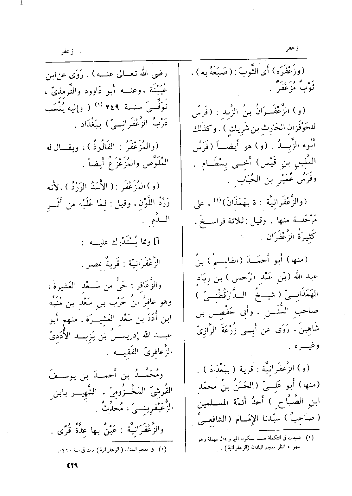 (و) الزَّعفَرانِيَّة: قَرْيَة (ببَغْدَادَ) . (مِنْهَا) أَبو عَلِيّ (الحَسَنُ بنُ محمّدِ بنِ الصَّبَّاحِ) أَحدُ أَئمّة الْمُسلمين (صاحِبُ) سيّدنا الإِمَام (الشافِعِيِّ رَضِي الله تَعَالَى عَنهُ) . رَوَى عَن ابْن عُيَيْنَة، وَعنهُ أَبو دَاوود والتِّرمِذِيّ، تُوَفِّيَ سنة 249 (وإِليه يُنْسَب دَرْبُ الزَّعْفَرانِيّ) ببَغْدَاد.