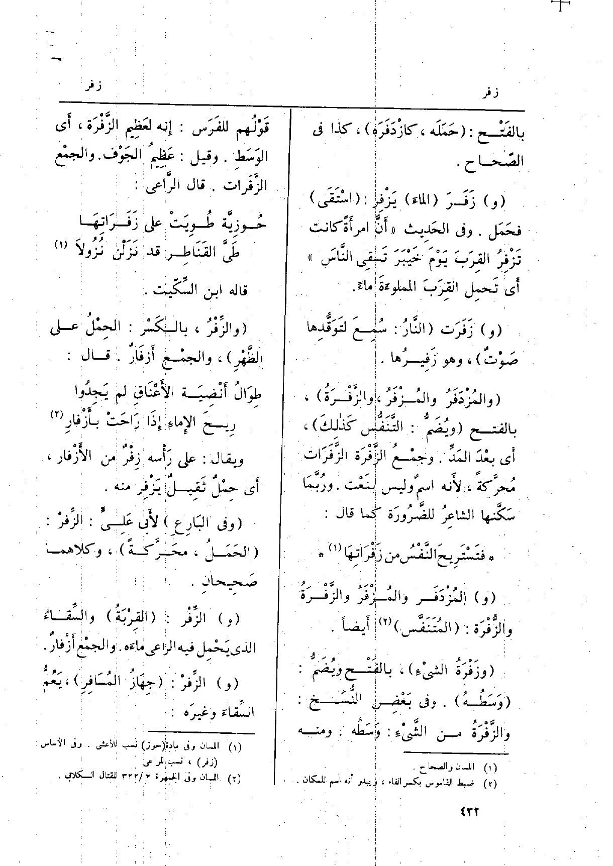 (وَفِي البَارِعِ) لأَبي عَلِيَ: الزِّفرْ: (الحَمَلُ، محَرَّكةً) ، وَكِلَاهُمَا صَحِيحانِ.