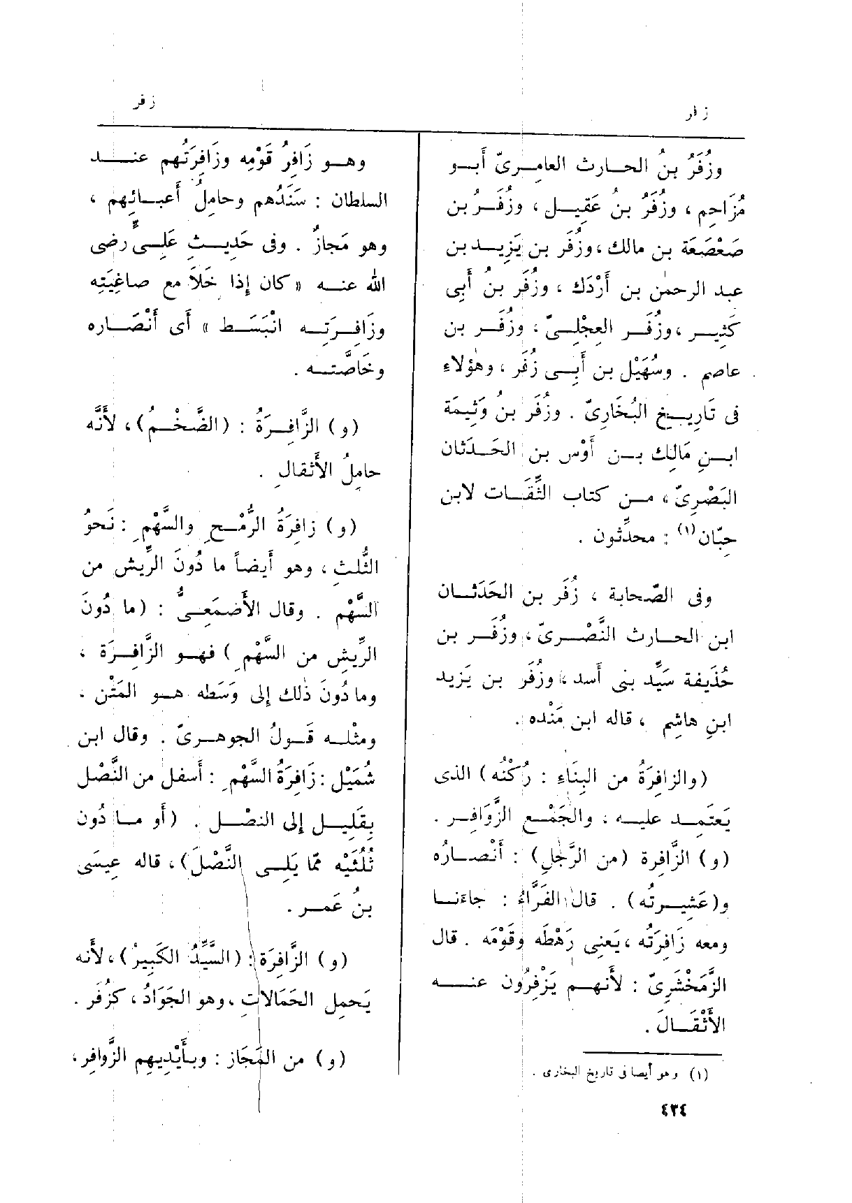 وَهُوَ زَافِرُ قَوْمِهِ وزَافِرتُهم عِنْد السُّلْطَان: سَنَدُهم وحامِلُ أَعبائِهم، وَهُوَ مَجازٌ. وَفِي حَدِيثِ عَلِيَ رَضِي الله عَنهُ (كَانَ إِذا خَلاَ مَعَ صاغِيَتِه وزَافِرَتِه انْبَسَط) أَي أَنْصَاره وخَاصَّته.