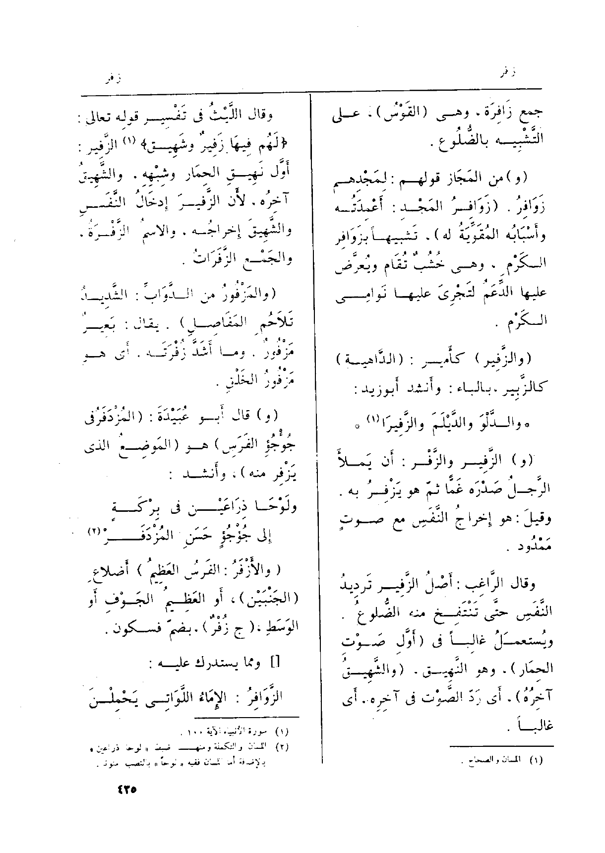 وَقَالَ اللَّيْثُ فِي تَفْسِير قولِه تَعَالَى: {لَهُمْ فِيهَا زَفِيرٌ وَشَهِيقٌ} (الْأَنْبِيَاء: 1) الزَّفِير: أَوَّل نَهِيقِ الحِمَار وشِبْهِه، والشَّهِيقُ آخِرُه، لأَن الزَّفيرَ إِدخَالُ النَّفَس والشَّهِيقَ إِخراجُه، والاسمُ الزَّفْرَةُ، والجَمْع الزَّفَرَاتُ.