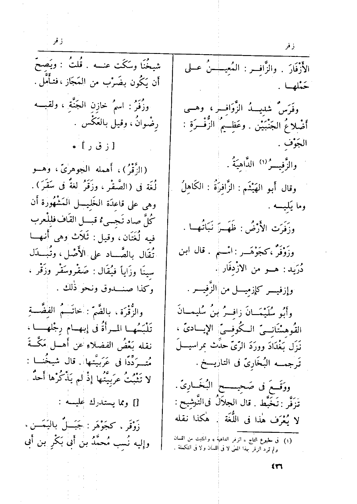 ووَقَعَ فِي صَحِيح البُخَارِيّ. تَزَفَّر: تَخَبَّط. قَالَ الجلاَلُ فِي التَّوشِيح: لَا يُعْرَف هاذا فِي اللُّغة. هاكذا نَقله شيخُنا وسَكَت عَنهُ. قُلتُ: ويَصِحّ أَن يَكُون بضَرْب من المَجَاز، فتأَمَّل.