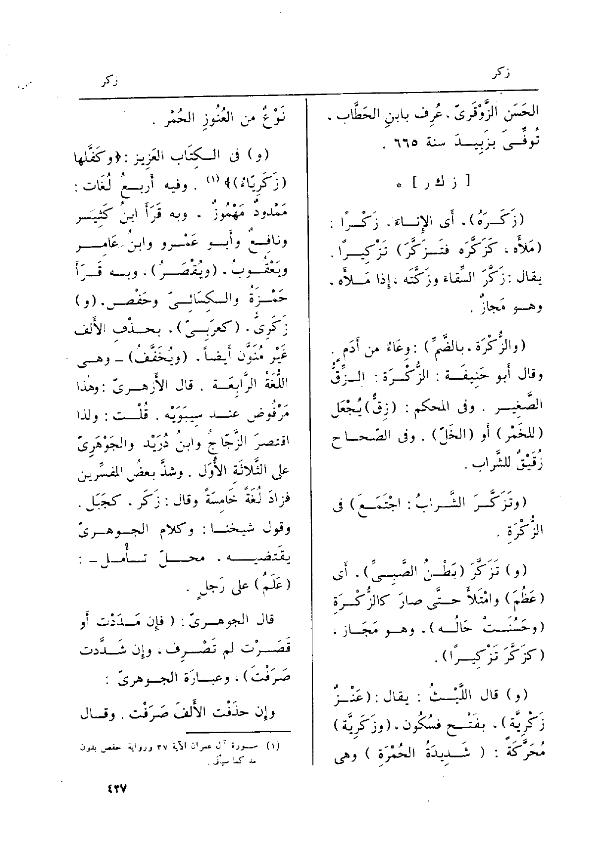 (و) فِي الكِتَاب العَزِيز: {) 1 (. 027 وكفلها زَكَرِيَّاء} (آل عمرَان: 37) . وَفِيه أَربعُ لُغَات: مَمْدُودٌ مَهْمُوزٌ، وَبِه قَرَأَ ابنُ كَثِير ونافِعٌ وأَبو عَمْرو وابنُ عَامِر ويَعْقُوبُ، (ويُقْصَرُ) ، وَبِه قَرَأَ حَمْزَةُ والكِسَائِيّ وحَفْص، (و) زَكَرِيُّ، (كعرَبِيّ) ، بحذْفِ الأَلف غَيْر مُنَوَّن أَيضاً، (ويُخَفَّفُ) وَهِي اللُّغَةُ الرَّابِعَة. قَالَ الأَزهريّ: وهاذا مَرْفُوض عِنْد سِيبَيَوَيْه. قُلْت: وَلذَا اقتصرَ الزَّجّاجُ ابنُ دُرَيْد والجَوْهَرِيّ على الثَّلاثَةِ الأُوَل. وشذَّ بعضُ المفسِّرين فزادَ لُغَةً خَامِسَةً وَقَالَ: زَكَر، كجَبَل. وَقَول شَيخنَا: وَكَلَام الجوهريّ يقَتضيه، محلّ تأْمل: (عَلَمٌ) على رَجلٍ.