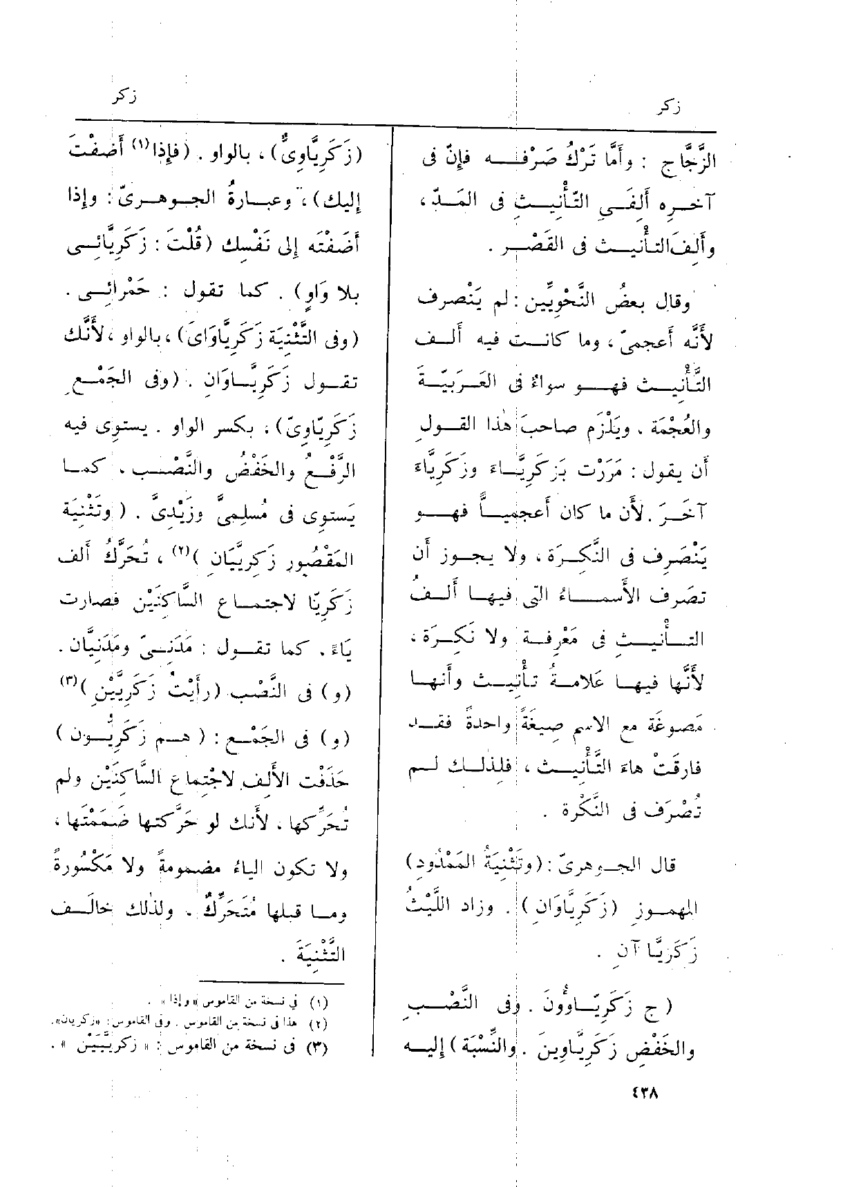 (ج زَكَرِيّاؤُونَ. وَفِي النَّصْبِ والخَفْضِ زَكَرِيَّاوِينَ. والنِّسْبَة) إِليه (زَكَرِيَّاوِيٌّ) ، بِالْوَاو. (فإِذا أَضفْتَ إِليك) ، وعبارةُ الجوهريّ: وإِذا أَضَفْتَه إِلى نَفْسِك (قُلْتَ: زَكَرِيَّائِي بِلَا وَاوٍ) . كَمَا تَقول: حَمْرَائِي. (وَفِي التَّثْنِيَة زَكَرِيَّاوَايَ) ، بِالْوَاو، لأَنَّك تَقول زَكَرِيَّاَانِ. (وَفِي الجَمْعِ زَكَرِيّاوِيّ) ، بِكَسْر الْوَاو. يستوِي فِيهِ الرَّفْعُ والخَفْضُ والنَّصْب، كَمَا يَستوِي فِي مُءْلِميَّ وزَيْدِيَّ. (وتَثْنِيَة المَقْصُور زَكِريَّيَانِ) ، تُحَرَّكُ أَلف زَكَرِيّا لِاجْتِمَاع السَّاكِنَيْن فَصَارَت يَاءً، كَا تَقول: مَدَنِيّ ومَدَنِيَّان. (و) فِي النَّصْب (رأَيْتُ زَكَرِيَّيْنِ) (و) (رأَيْتُ زَكَرِيَّيْنِ) (و) فِي الجَمْع (هم زَكَرِيُّون) حَذَفْت الأَلِف لاجْتِماع السَّاكِنَيْن وَلم تُحَرِّكها، لأَنك لَو حَرَّكتها ضَمَمْتَها، وَلَا تكون الياءُ مَضْمُومَة وَلَا مَكْسُورةً وَمَا قبلهَا مُتَحَرِّكٌ، ولذالك خالَف التَّثْنِيَةَ.