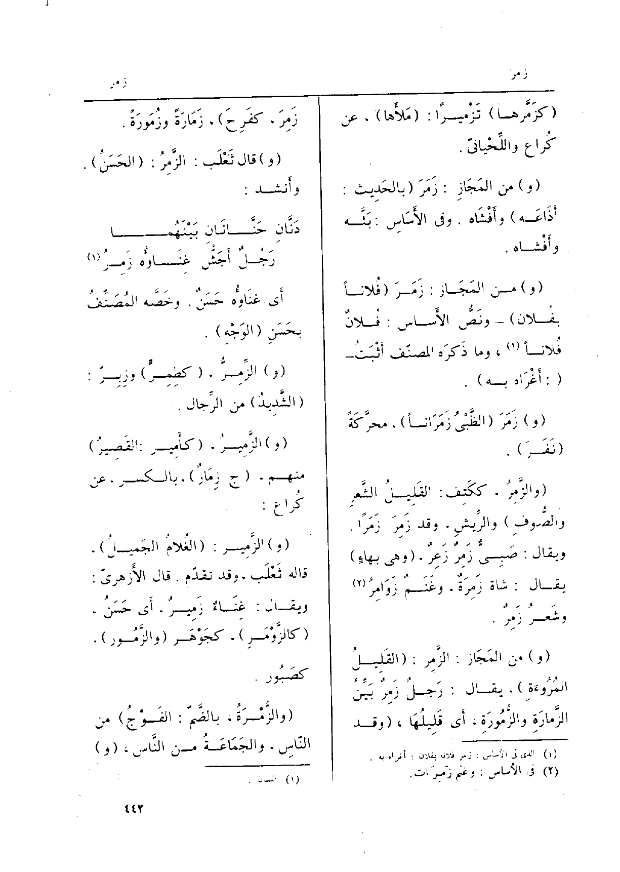 (و) من المَجَاز: الزَّمِر: (القَلِيلُ المُرْوءَةِ) ، يُقَال: رَجلٌ زَمِرٌ بَيِّنُ الزَّمَارَةِ والزُّمُورَةِ، أَي قَلِيلُهَا، (وَقد زَمِرَ، كفَرِحَ) ، زَمَارَةً وزُمُورَةً.