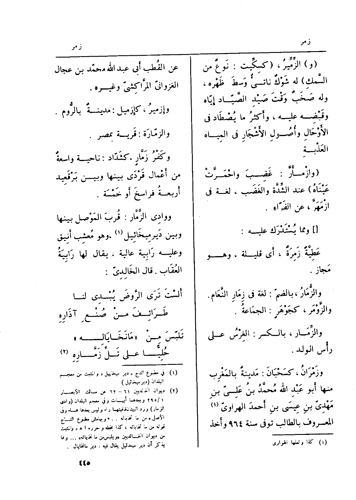 ووادِي الزَّمَّار: قُربَ المَوْصل بَينهَا وَبَين دَير مِيخَائِيل، وَهُوَ مُعشِب أَنِيق وَعَلِيهِ رَابِية عالية، يُقَال لَهَا رَابِيَةُ العُقَاب. قَالَ الخَالِدِيّ: