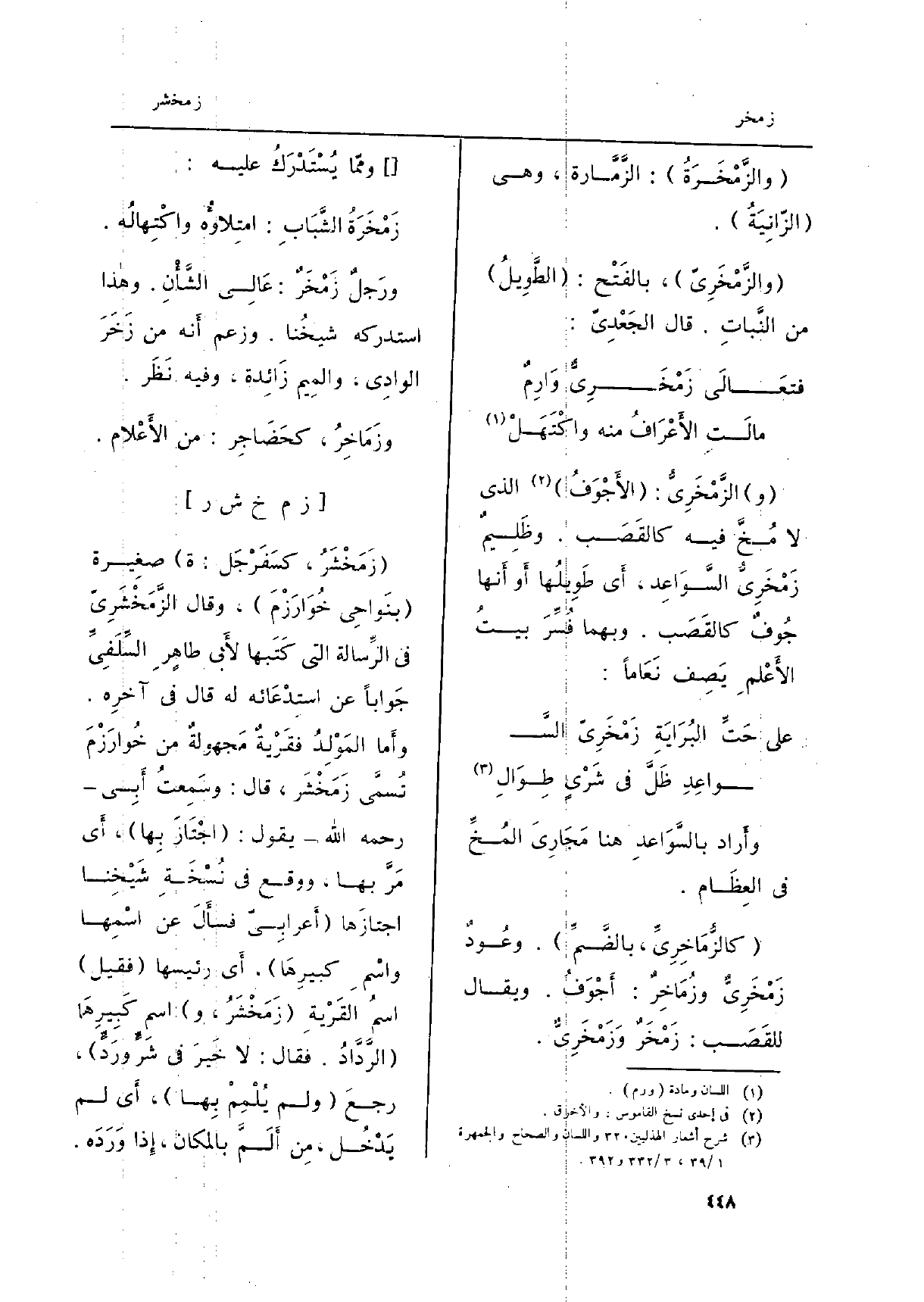 (كالزُّمَاخِرِيِّ، بالضَّمِّ) . وعُودٌ زَمْخَرِيٌّ وزُمَاخِرٌ: أَجْوَفُ. وَيُقَال للقَصَب: زَمْخَرٌ وَزَمْخَرِيٌّ.