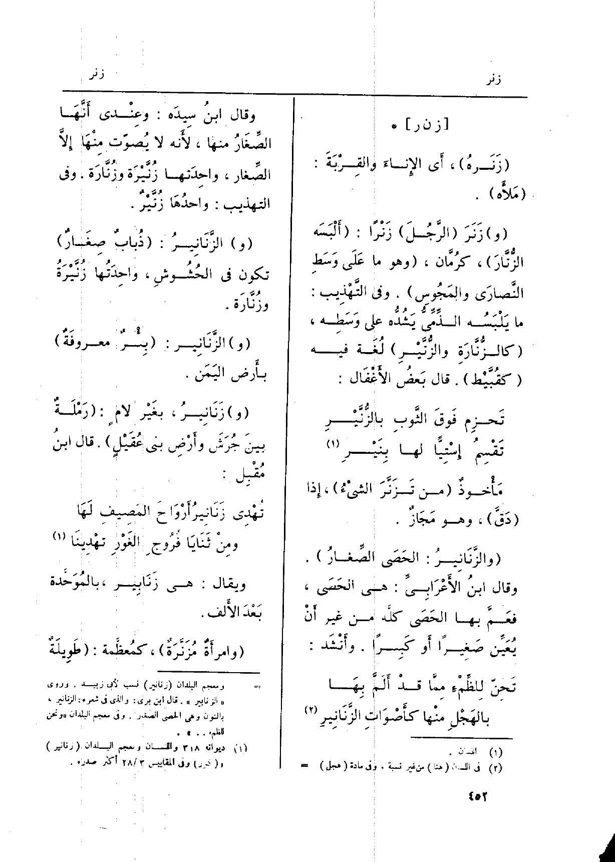 (و) الزَّنَانِير: (بِئْرٌ معروفَةٌ) بأَرض اليَمَن.