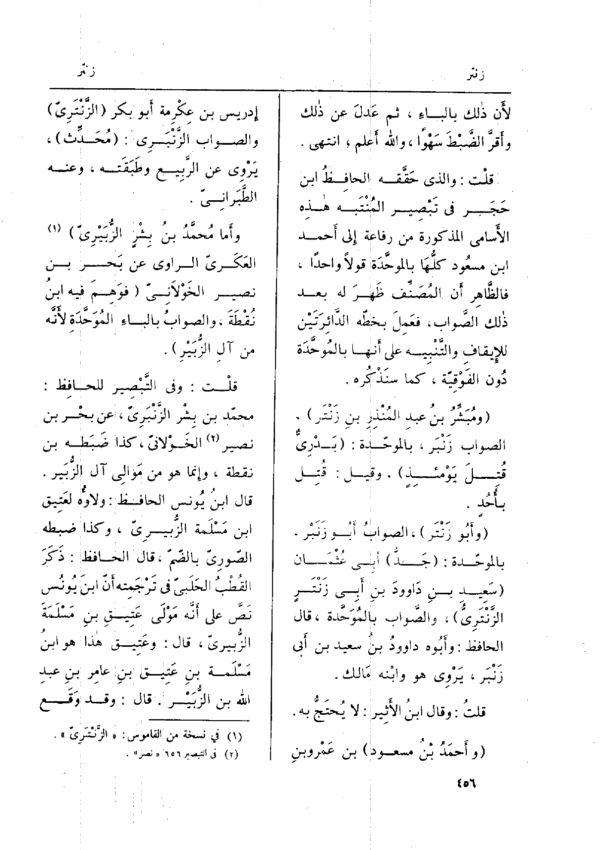 قلْت: وَفِي التَّبْصِير للحافِظ: محمّد بن بِشْر الزَّنْبَرِيّ، عَن بحْر بن نصير الخَوْلانيّ، كَذَا ضَبَطه بن نقطة، وإِنما هُوَ من مَوالِي آل الزُّبَير. قَالَ ابنُ يُونس الْحَافِظ: ولاؤُه لعَتِيق ابْن مَسْلَمة الزُّبيرِيّ، وَكَذَا ضَبطه الصّورِيّ بالضّمّ، قَالَ الْحَافِظ: ذَكَرَ القُطْبُ الحَلَبيّ فِي تَرّجَمتِه أَنّ ابنَ يُونُس نَصَّ على أَنَّه مَوْلَى عَتِيقِ بنِ مَسْلَمَة الزُّبيريّ، قَالَ: وعَتِيق هاذا هُوَ ابنُ مَسْلَمة بنِ عَتِيق بنِ عامِر بنِ عبد الله بن الزُّبَيْر. قَالَ: وَقد وَقَعَ