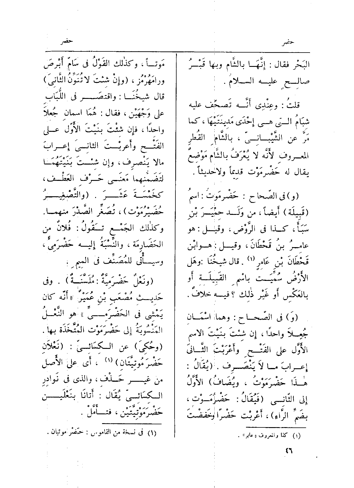 قلتُ: وعِنْدِي أَنَّه تَصحّف عَلَيْهِ شِبَامُ الَّتِي هِيَ إِحْدَى مَدِينَتَيْهَا، كَمَا مَرَّ عَن الشَّيْبانِيّ، بالشَّامِ القُطرِ المعروفِ لأَنَّه لَا يُعْرَفُ بالشَّام مَوْضِعٌ يُقَال لَهُ حَضْرمَوْت قدِيماً وَلَا حَدِيثا.