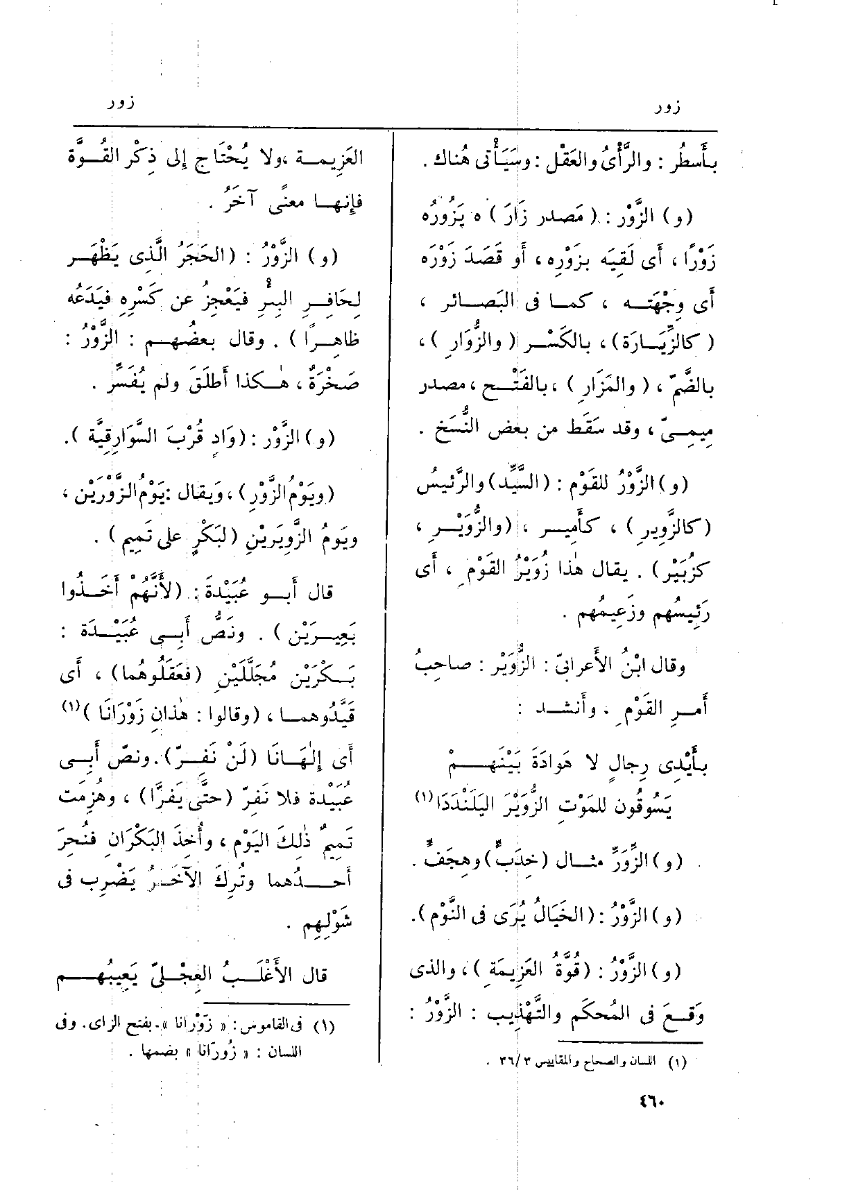 (و) الزَّوْرُ: (الحَجَرُ الَّذِي يَظْهَر لِحَافِرِ البِئْرِ فيَعْجِزُ عَن كَسْرِهِ فيَدَعُه ظاهِراً) . وَقَالَ بعضُضهم: الزَّوْرُ: صَخْرَةٌ، هاكذا أَطلَقَ وَلم يُفَسِّر.