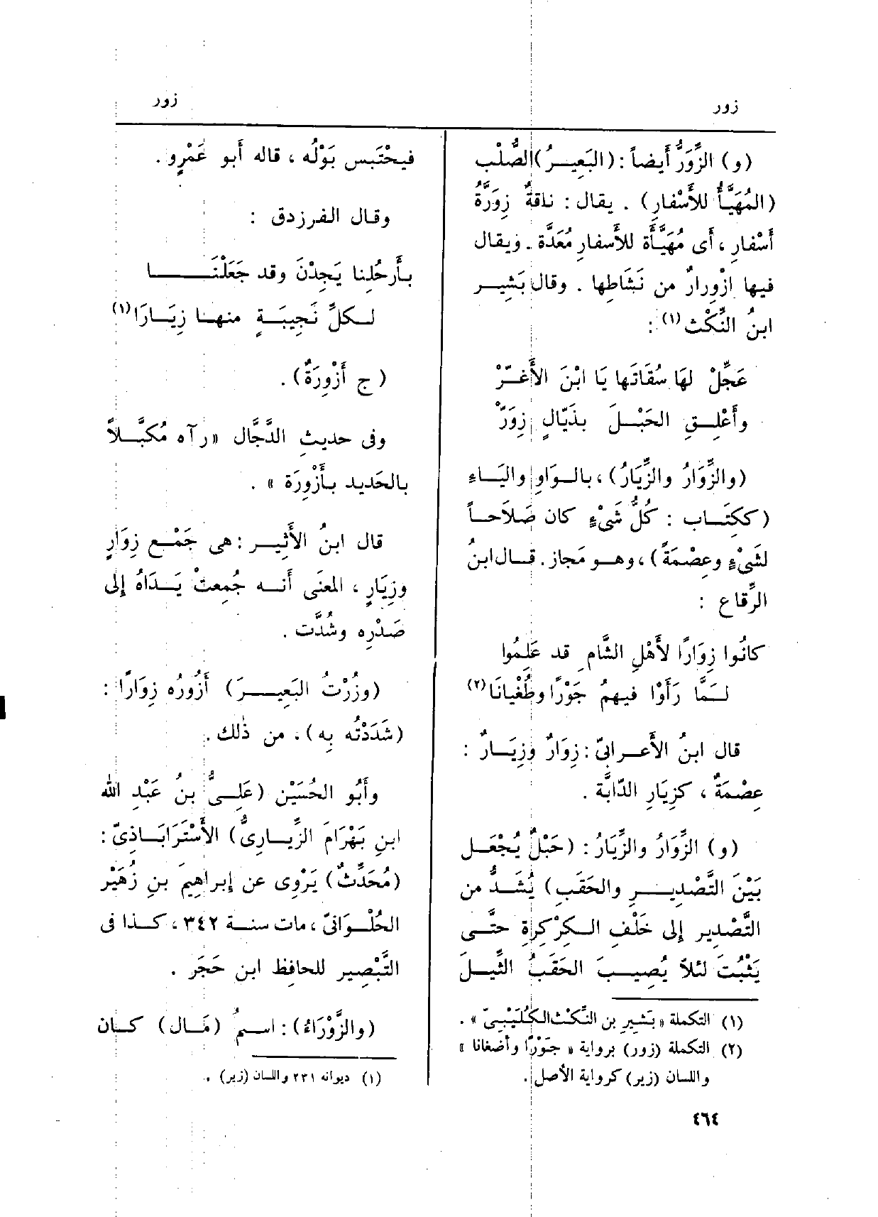 قَالَ ابنُ الأَعرابيّ:} زِوَارٌ {وزِيَارٌ: عِصْمَةٌ،} كزِيَارِ الدّابَّة.