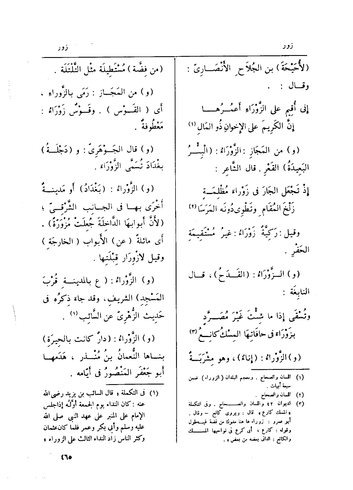 (و) الزَّوْرَاءُ: (بَغْدَادُ) أَو مَدينةٌ أُخْرَى بهَا فِي الجانِب الشَّرْقِيّ؛ (لأَنَّ أَبوابهَا الدَّاخِلَةَ جُعِلَتْ} مُزْوَرّةً) ، أَي مائلةً (عَن) الأَبواب (الخارجَةِ) وَقيل! لازْوِرَاء قِبْلَتِها.