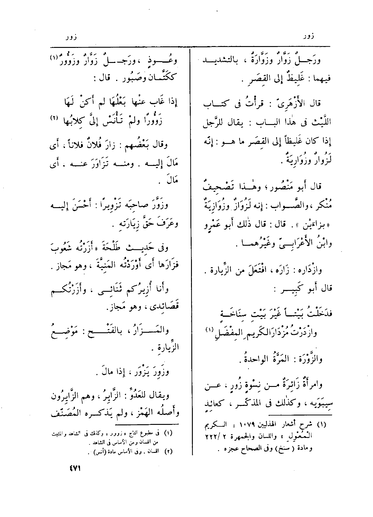 وَقَالَ بَعْضُهم: زارَ فُلانٌ فلَانا، أَي مَالَ إِليه. وَمِنْه {تَزَاوَرَ عَنهُ، أَي مَالَ.