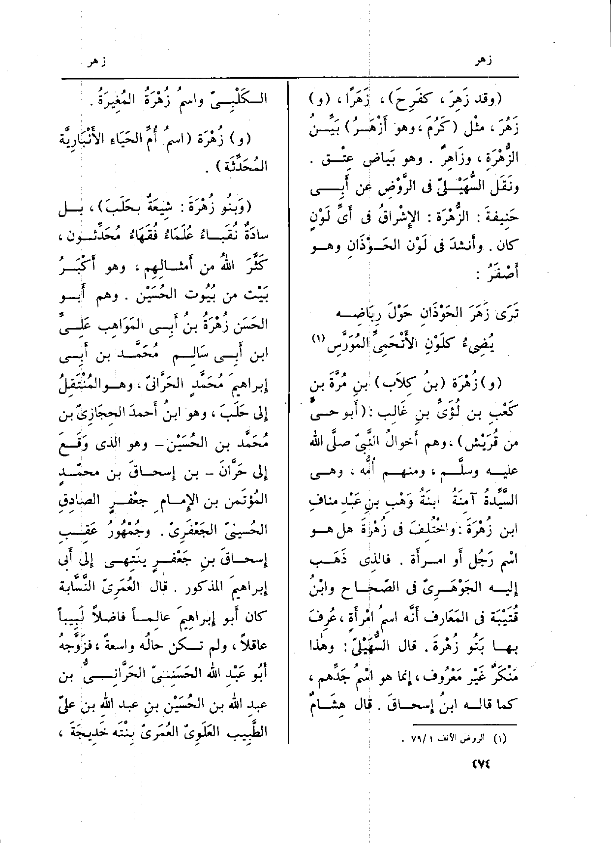 (وَبنُو زُهْرَةَ: شِيعَةٌ بحَلَبَ) ، بل سادَةٌ نُقَباءُ عُلَمَاءُ فُقَهَاءُ مُحَدِّثون، كَثَّرَ اللهاُ من أَمثالِهِم، وَهُوَ أَكْبَرُ بَيْت من بُيُوت الحُسَيْن. وهم أَبو الحَسَن زُهْرَةُ بنُ أَبِي المَوَاهِب عَلِيِّ ابْن أَبِي سَالِم مُحَمَّد بن أَبِي إِبرايمَ مُحَمَّدٍ الحَرَّانيّ، وَهُوَ المُنْتَقِلُ إِلى حَلَبَ، وَهُوَ ابنُ أَحمدَ الحِجَازِيّ بن مُحَمَّد بن الحُسَيْن وَهُوَ الَّذِي وَقَعَ إِلى حَرَّانَ بن إِسحاقَ بن محمّدٍ المُؤتَمن بن الإِمامِ جعْفرٍ الصادِقِ الحُسينيّ الجَعْفَرِيّ. وجُمْهُورُ عَقِبِ إِسحاقَ بنِ جَعْفرٍ ينتَهِي إِلى أَبي إِبراهيمَ الْمَذْكُور. قَالَ العُمَرِيّ النَّسَّابة كَانَ أَبو إِبراهيمَ عالِماً فَاضلا لَبهيباً عَاقِلا، وَلم تكن حالُه وَاسِعَة، فزَوَّجهُ أَبُو عَبدِ الله الحَسَنِيّ الحَرَانِيُّ بن عبدِ الله بن الحُسَيْنِ بنِ عبد اللهاِ بن عليّ الطَّبِيب العَلَوِيّ العُمَريّ بِنْتَه خَدِيجَةَ،