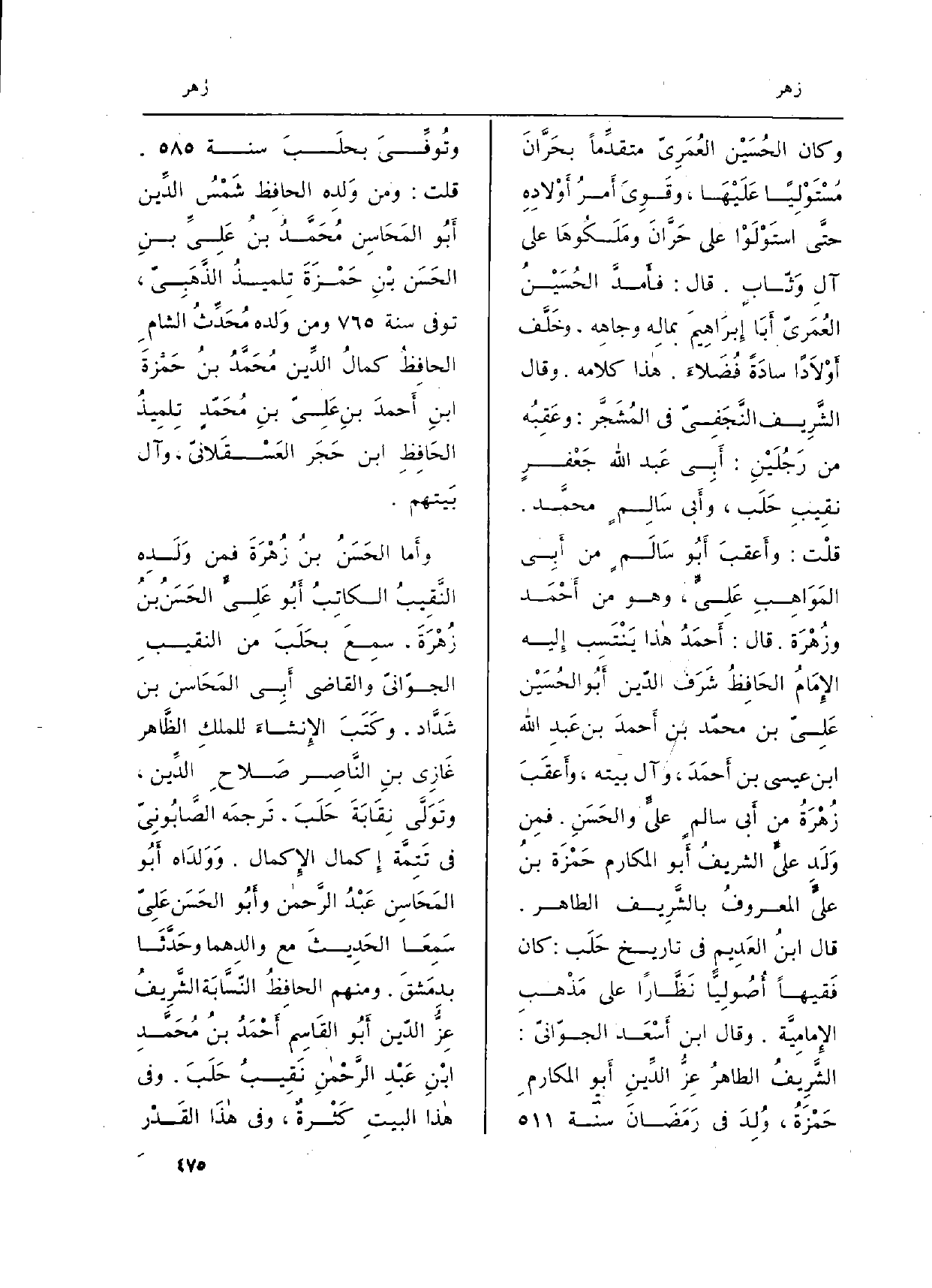 وأَما الحَسَنُ بنُ زُهْرَةَ فَمن وَلَدِه النَّقِيبُ الكاتِبُ أَبُو عَلِيَ الحَسَنُ بنُ زُهْرَةَ، سمِعَ بحَلَبَ من النقيبِ الجوّانيّ وَالْقَاضِي أَبِي المَحَاسن بن شَدَّاد، وكَتَبَ الإِنشاءَ للملكِ الظَّاهر غَازِي بنِ النَّاصِر صَلاحِ الدِّين، وتَوَلَّى نِقَابَةَ حَلَبَ، تَرجمَه الصَّابُونِيّ فِي تَتِمَّة إِكمال الإِكمال. وَوَلَدَاه أَبُو المَحَاسِن عَبْدُ الرَّحمان وأَبُو الحَسَن عَلِيّ سَمِعَا الحَدِيثَ مَعَ والدِهما وحَدَّثَا بِدَمَشقَ. وَمِنْهُم الحافِظُ النّسَّابَة الشَّرِيفُ عِزُّ الدّين أَبُو القَاسِم أَحْمَدُ بنُ مُحَمَّدِ بْنِ عَبْدِ الرَّحْمانِ نَقِيبٌ حَلَبَ. وَفِي هاذا البيتِ كَثْرَةٌ، وَفِي هاذَا القَدْر