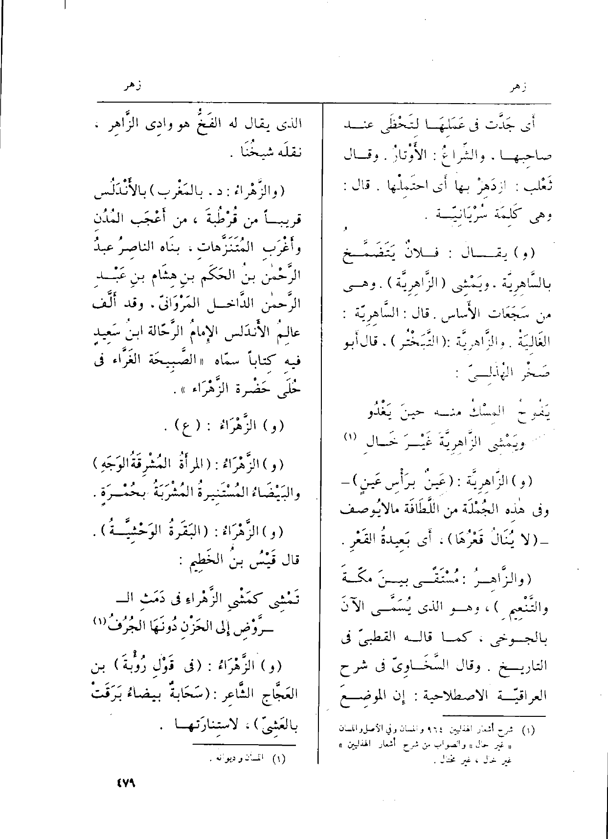 (والزَّهْرَاءُ: د، بالمَغْرب) بالأَنْدَلُس قَرِيبا من قُرْطُبةَ، من أَعْجَب المُدُنِ وأَغْرَبِ المُتَنَزَّهاتِ، بنَاه الناصِرُ عبدُ الرَّحمان بنُ الحَكَم بنِ هِشَام بنِ عَبْدِ الرَّحمان الدَّاخل المَرْوَانيّ، وَقد أَلَّف عالِمُ الأَندَلس الإِمامُ الرَّحّالة ابنُ سَعِيدٍ فيهِ كِتاباً سمّاه (الصَّبِيحَة الغَرَّاء فِي حُلَى حَرة الزَّهْرَاء) .