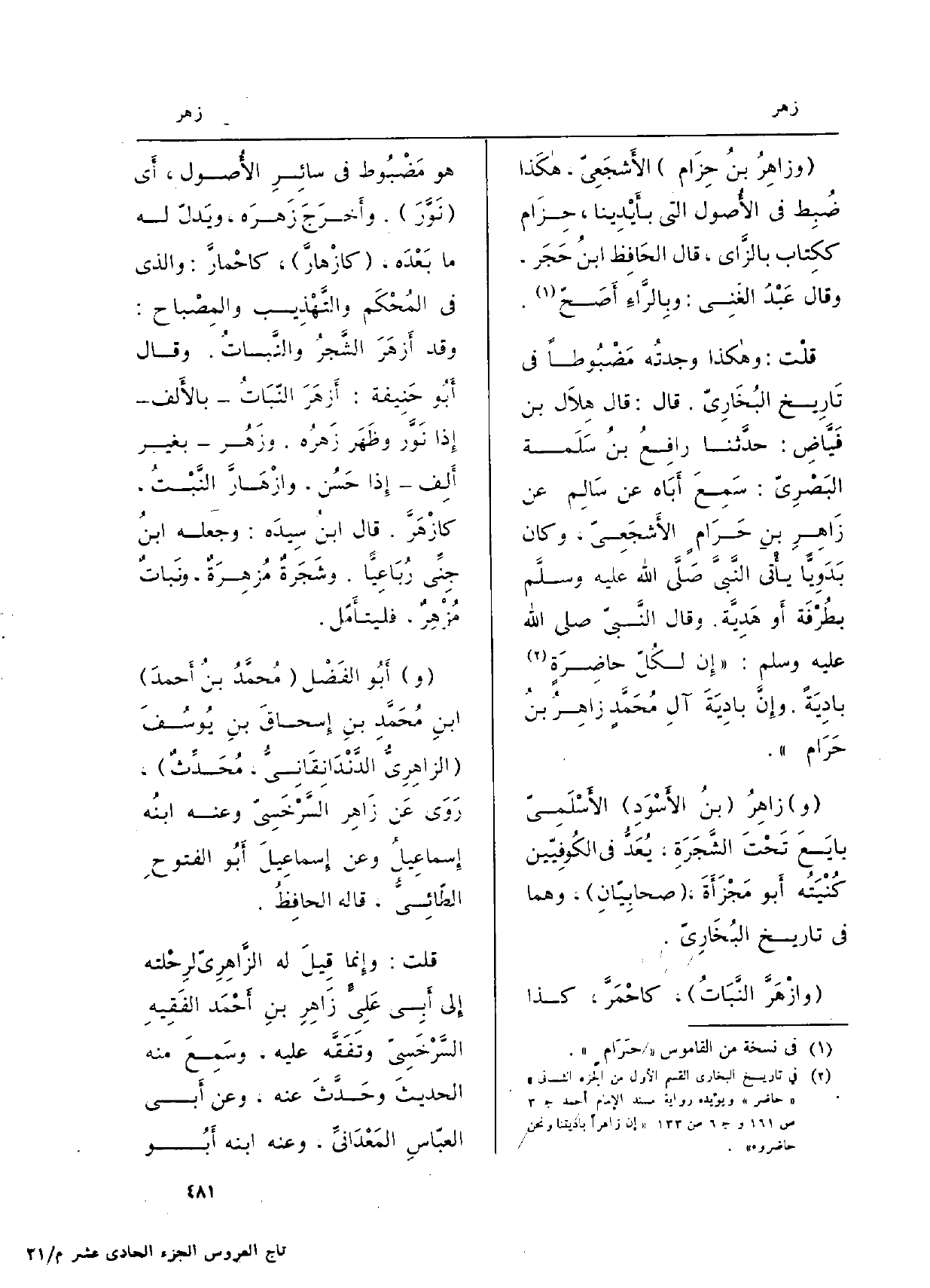 قلْت: وهاكذا وجدتُه مَضْبُوطاً فِي تَارِيخ البُخَارِيّ. قَالَ: قَالَ هِلاَل بن فَيَّاضِ: حدَّثنا رافِعُ بنُ سَلَمَة البَصْرِيّ: سَمِعَ أَبَاه عَن سَالِم عَن زَاهرِ بنِ حَرَامٍ الأَشجَعِيّ، وَكَانَ بَدَوِيًّا يأْتي النَّبيَّ صلى الله عَلَيْهِ وسلمبُطُرْفَة أَو هَدِيَّة. وَقَالَ النَّبيّ صلى الله عَلَيْهِ وَسلم (إِن لكُلّ حاضِرَةٍ بادِيَةً. وإِنَّ بادِيَةَ آلِ مُحَمَّدٍ زاهِرُ بنُ حَرَام) .