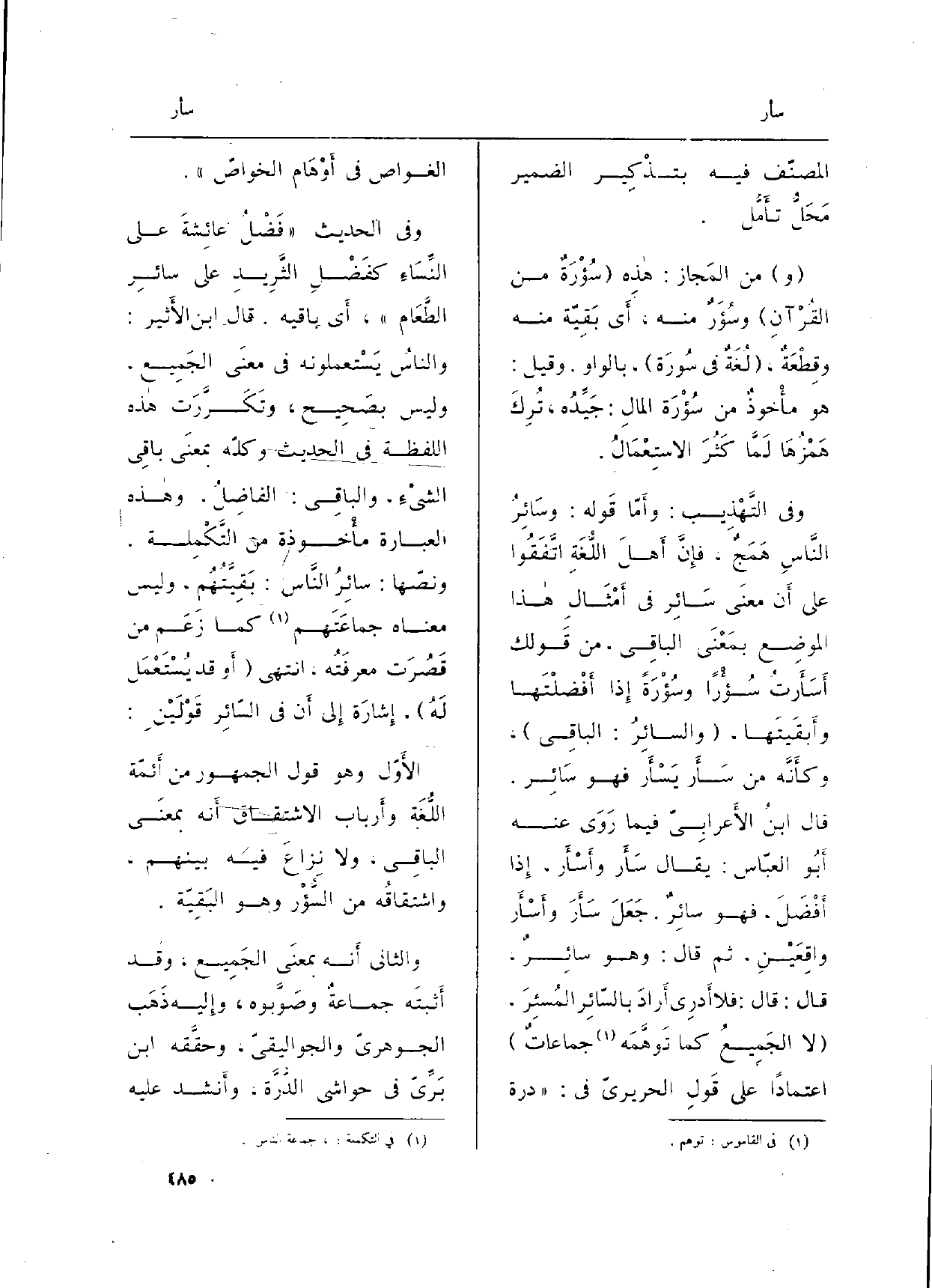 وَفِي التَّهْذِيب: وأَمّا قَوله:} وسَائِرُ النَّاسِ هَمَجٌ، فإِنَّ أَهلَ اللُّغَةِ اتَّفَقُوا على أَن معنَى {سَائِر فِي أَمْثَالِ هاذا الموضِع بمَعْنَى الباقِي، من قَولك} أَسأَرتُ {سُؤْراً} وسُؤْرَةً إِذا أَفْضلْتَها وأَبقَيتَها، ( {والسائِرُ: الباقِي) ، وكأَنَّه من} سَأَر {يَسْأَر فَهُوَ} سَائِر. قَالَ ابنُ الأَعرابِيّ فِيما رَوَى عَنهُ أَبُو العبّاس: يُقَال {سَأَر} وأَسْار، إِذا أَفْضَلَ، فَهُوَ {سائِرٌ. جَعَلَ} سَأَرَ {وأَسْأَر واقِعَيْنِ، ثمَّ قَالَ: وَهُوَ} سائِرٌ، قَالَ: قَالَ فَلَا أَدرِي أَرادَ {بالسّائِر} المُسئِرَ، (لَا الجَمِيعُ كَمَا تَوهَّمَه جماعاتٌ) اعْتِمَادًا على قَولِ الحريريّ فِي: (درة الغواص فِي أَوْهَام الخواصّ) .